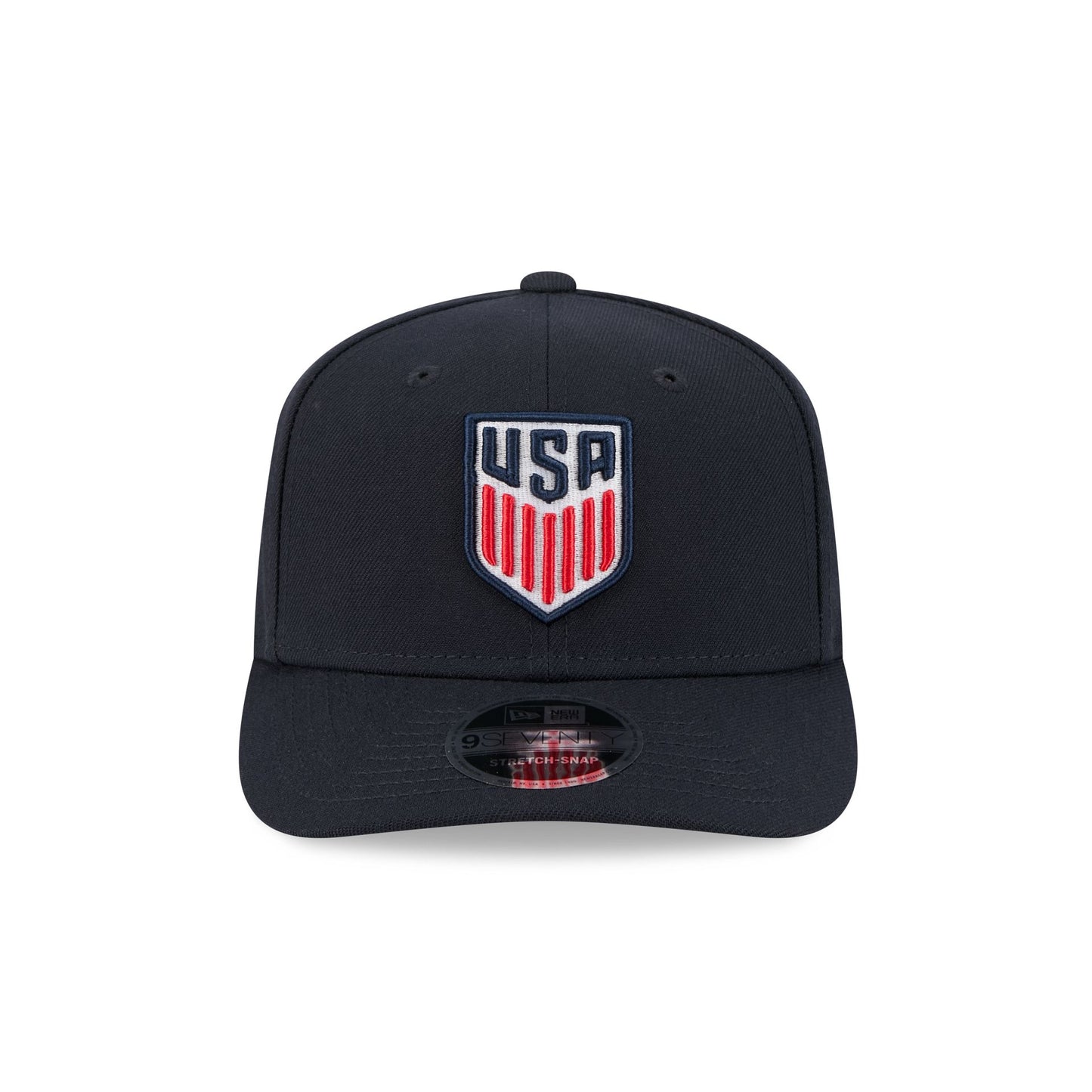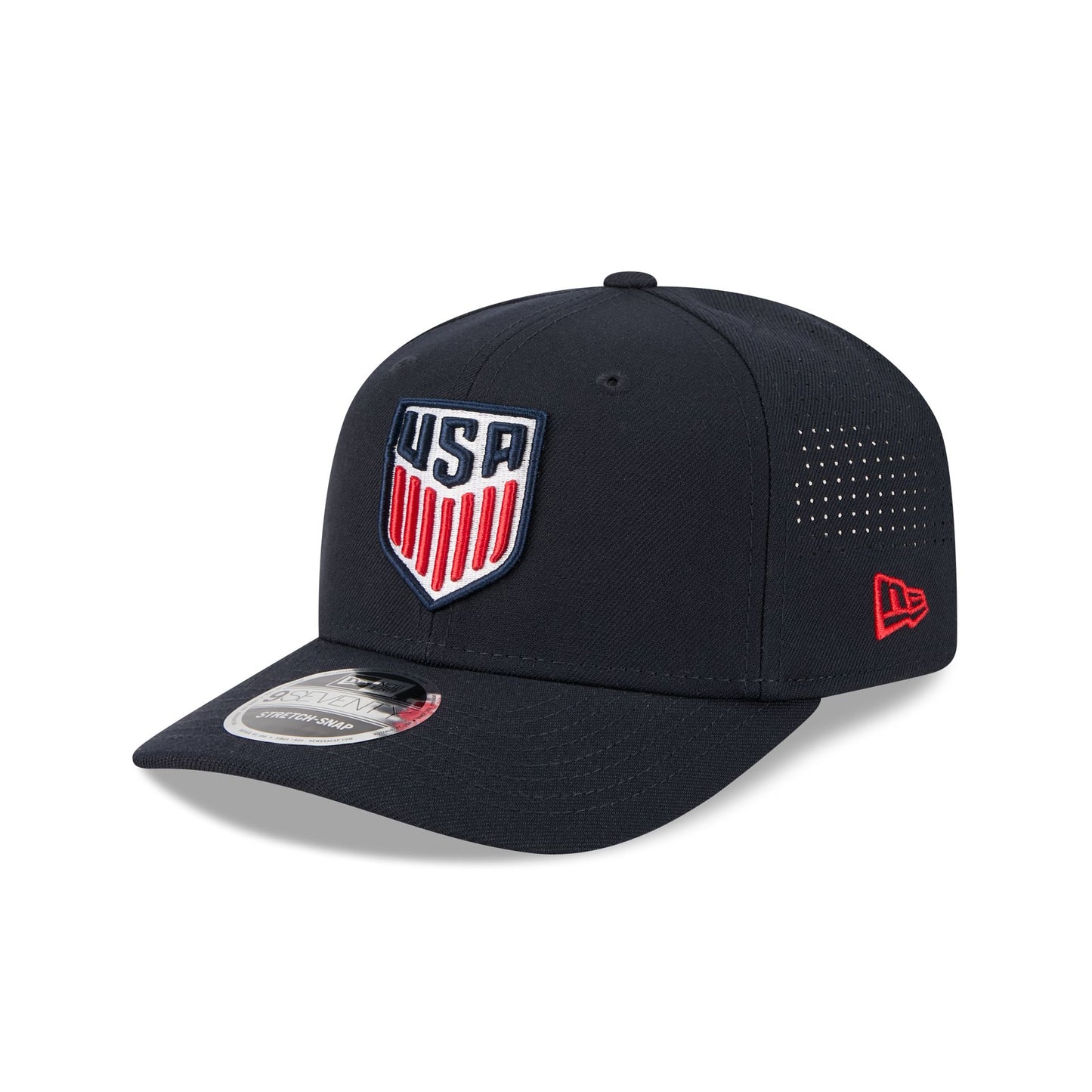 The U.S. Soccer Men's National Team Performance Mesh 9SEVENTY Trucker features an embroidered U.S. Soccer logo at the front panels with a matching woven team tag at a snapback closure at the rear and a gray undervisor.