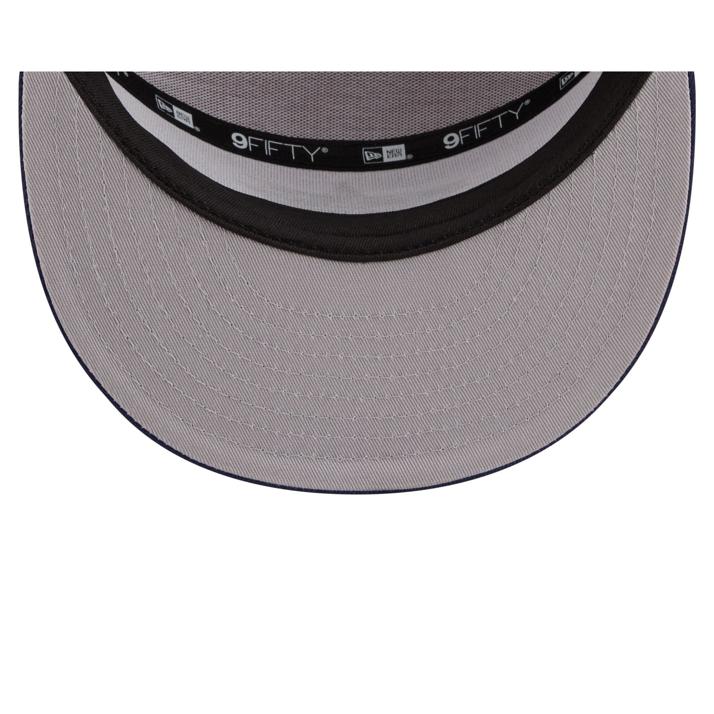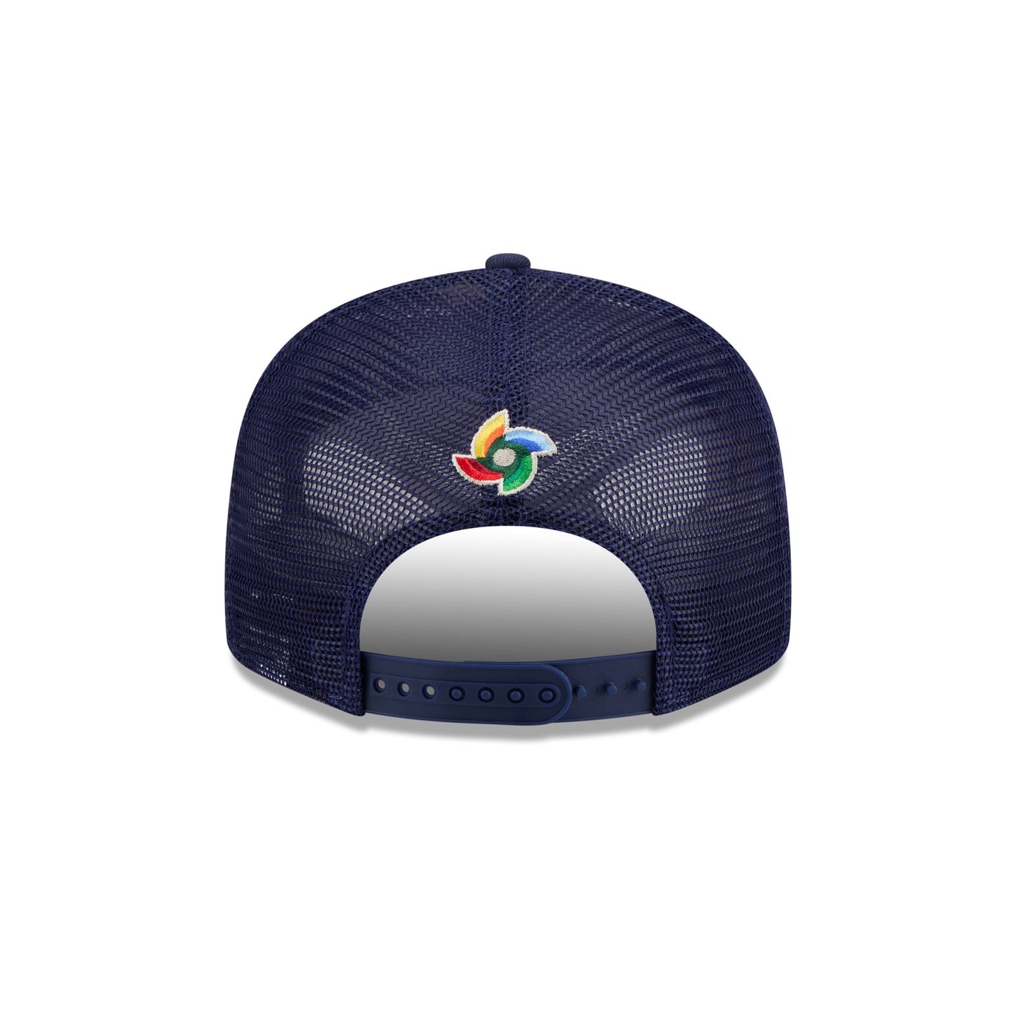 The USA Block Split Panel 9FIFTY Trucker features an embroidered USA logo at the front panels with a split crown construction. Additional details include a World Baseball Classic logo above an adjustable snapback closure at a mesh rear and a gray undervisor.