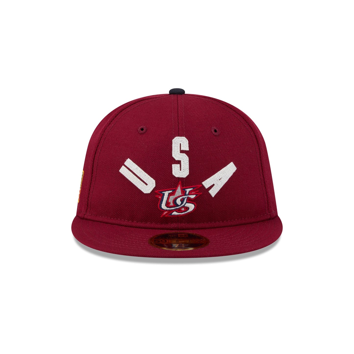 The USA Classic Script Retro Crown 59FIFTY Fitted Cap features a felt applique USA wordmark above an embroidered team logo at the front panels with a World Baseball Classic logo at the rear. Additional details include a matching team flag at the right-wear side with a pink undervisor.
