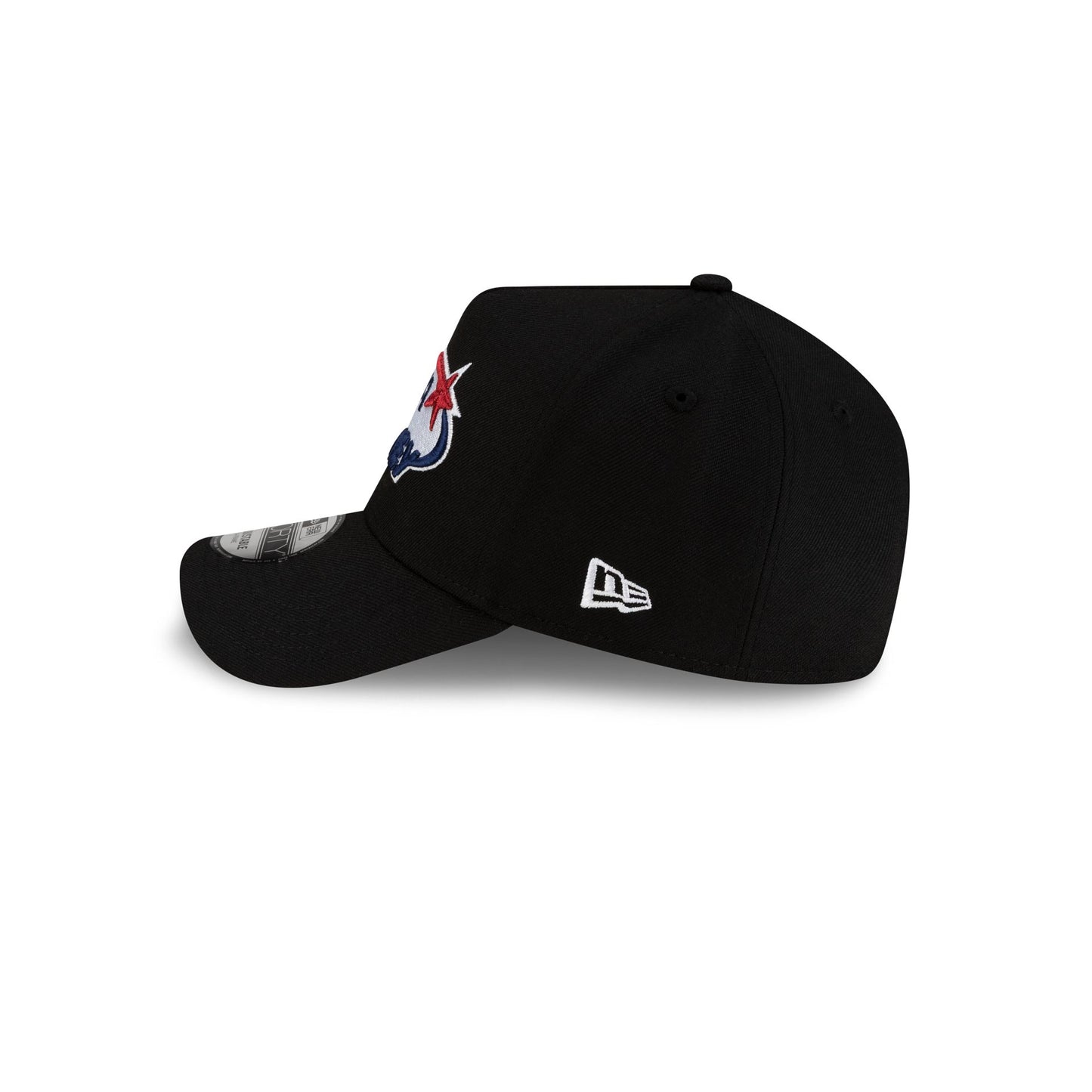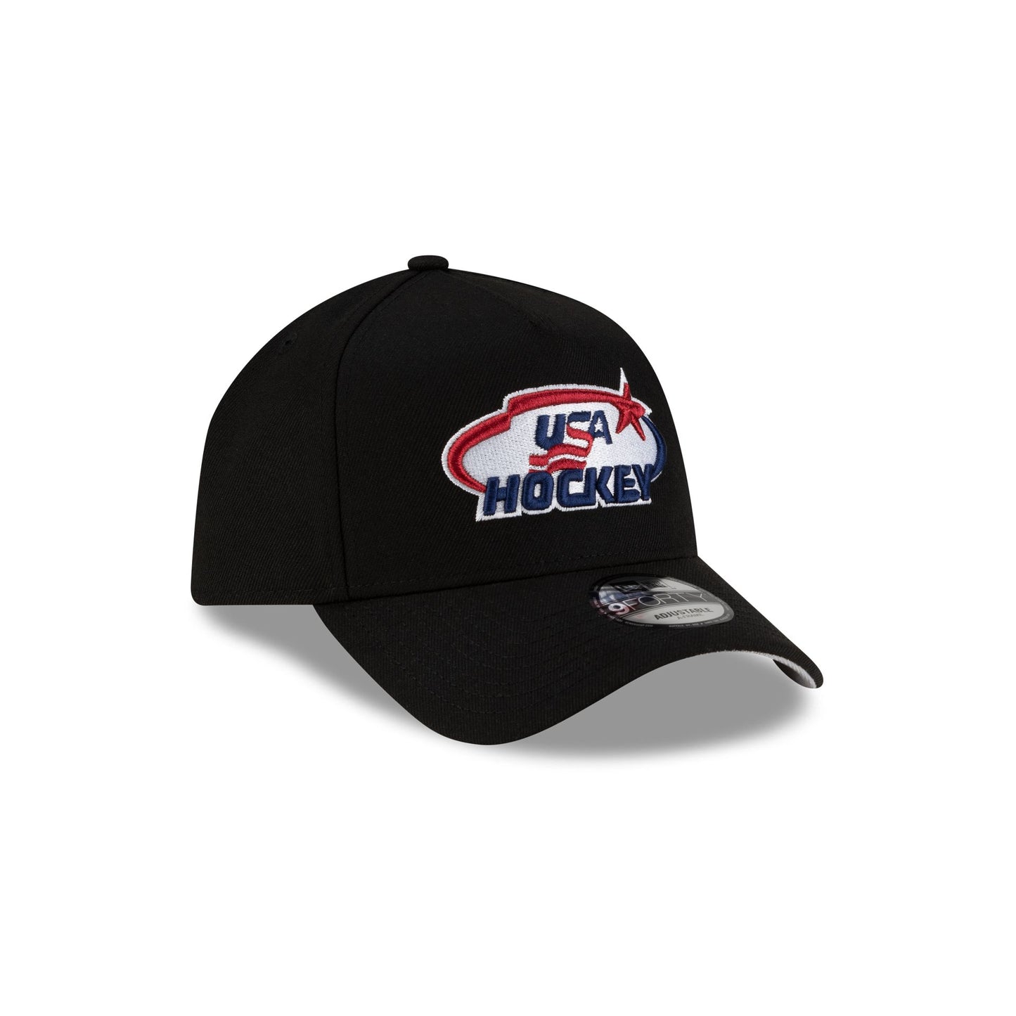 The USA Hockey Black 9FORTY A-Frame Snapback features an embroidered USA Hockey logo at the front panels wit an adjustable snapback closure at the rear and a gray undervisor.
