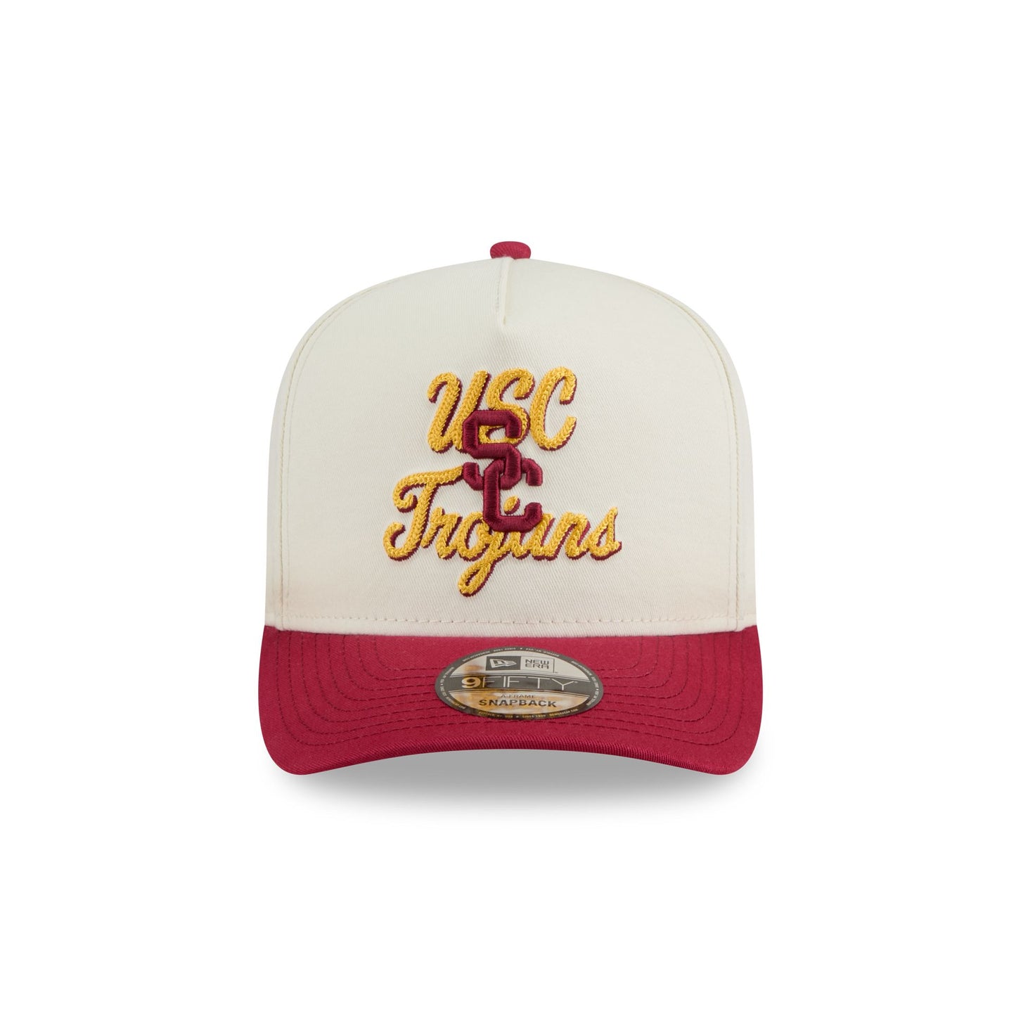 The USC Trojans Chainstitch 9FIFTY A-Frame Snapback features a chainstitch Trojans logo and script wordmark at the front panels with a snapback closure at the rear and a gray undervisor.