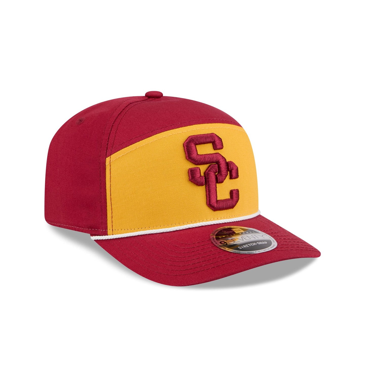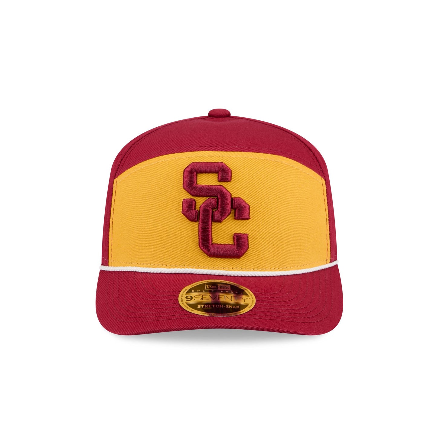 The USC Trojans Split Panel 9SEVENTY Stretch-Snap features an embroidered Trojans logo at the front panel with a split crown construction and a rope at the visor. Additional details include an adjustable stretch-snap closure at the rear and a gray undervisor.