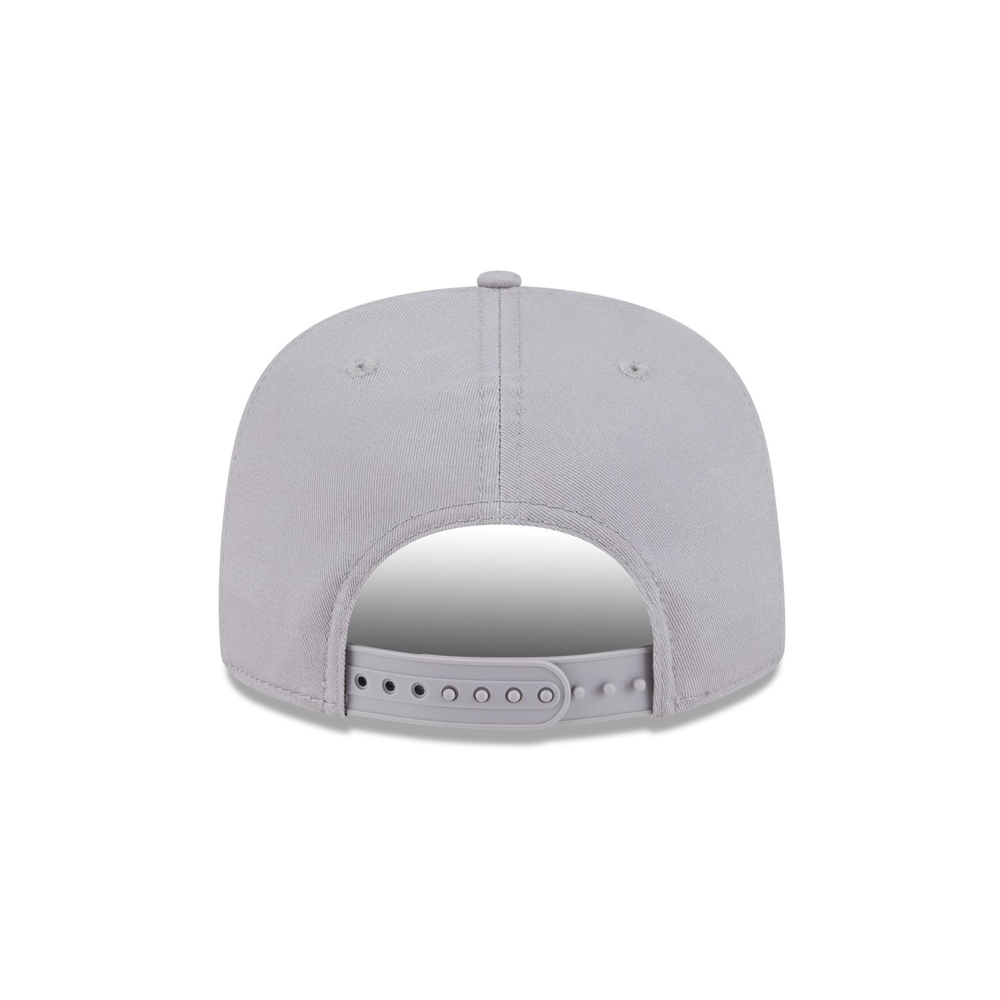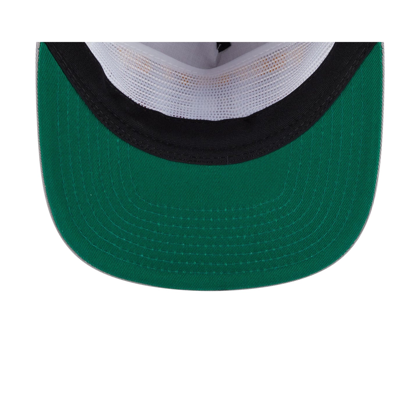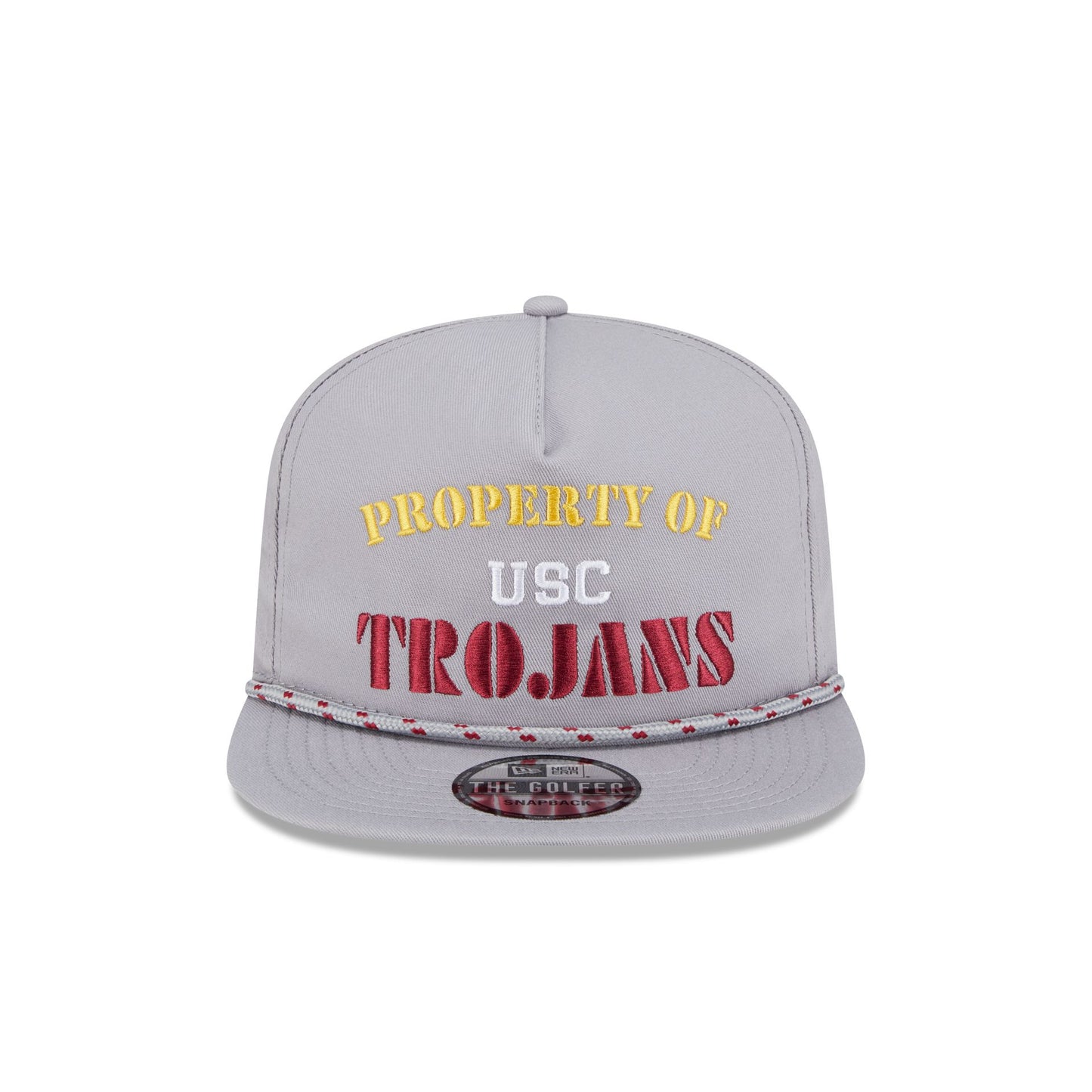 The USC Trojans Vintage Gray Golfer features an embroidered "PROPERTY OF" Trojans wordmark at the front panels with a team logo at the right-wear side and a rope at the visor. Additional details include a snapback closure at the rear and a green undervisor.