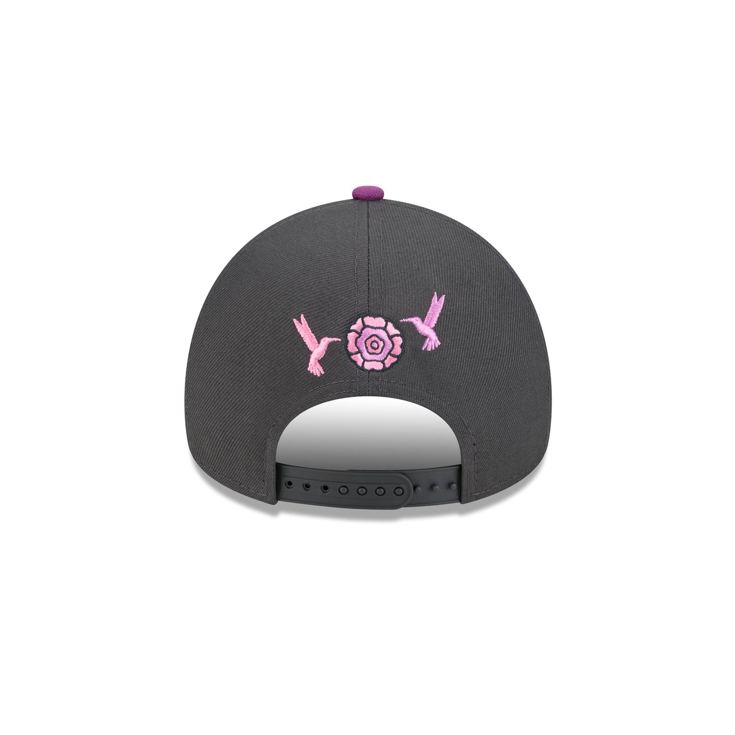 The Utah Hockey Club Day of the Dead Graphite 9FORTY A-Frame Snapback features an embroidered Mammoth logo at the front panels with marigold (cempasúchil) and hummingbird designs throughout, representing the Legend of Xóchitl and Huitzilin. Additional details include a team patch at the right-wear side and an adjustable snapback closure at the rear.