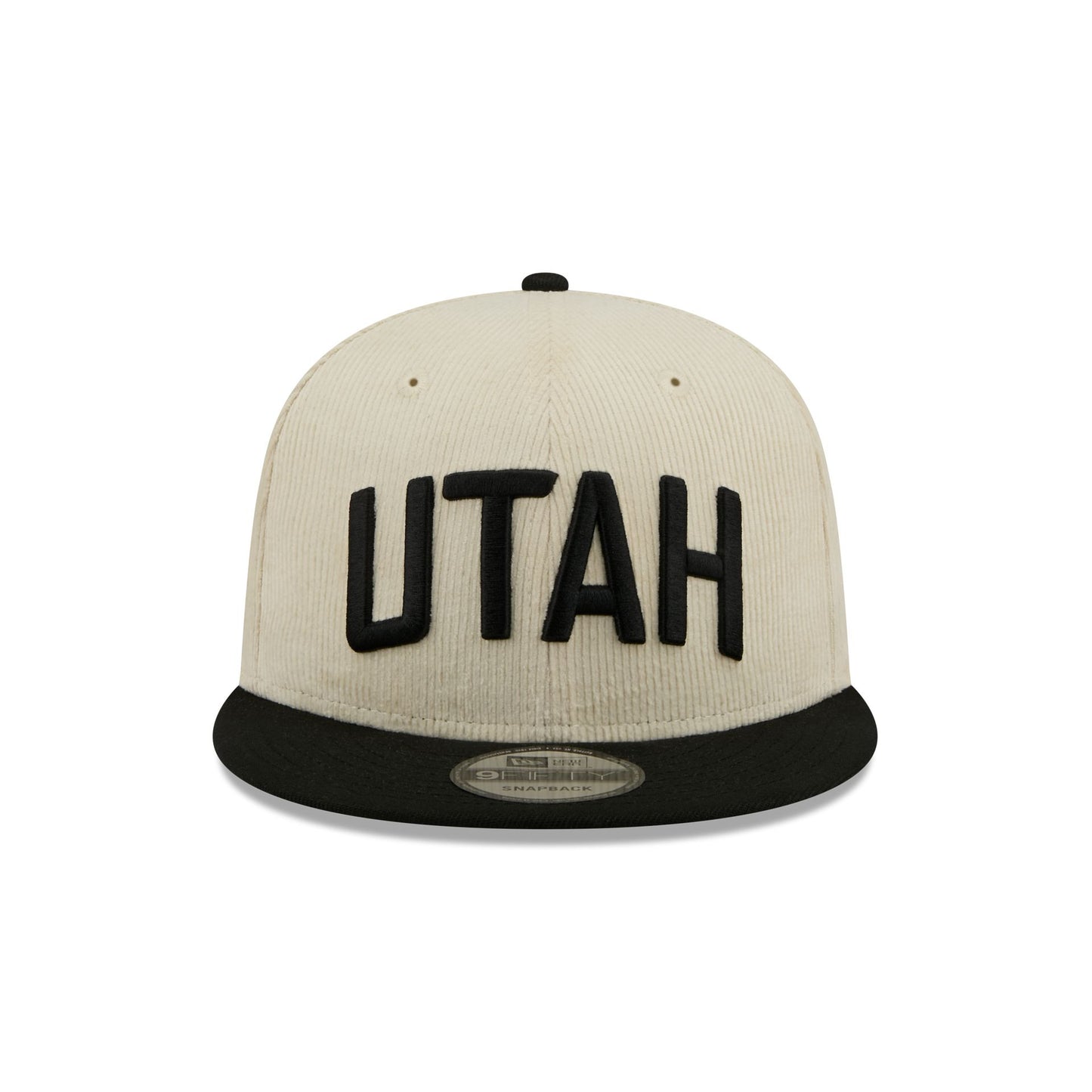 The Utah Jazz 2025 City Edition Chrome White Corduroy 9FIFTY Snapback features an embroidered Jazz City Edition logo at the front panels with a City Edition jock tag stitched at the right-wear side. Additional details include a corduroy fabrication, the NBA Logoman above an adjustable snapback closure at the rear, and a gray undervisor.