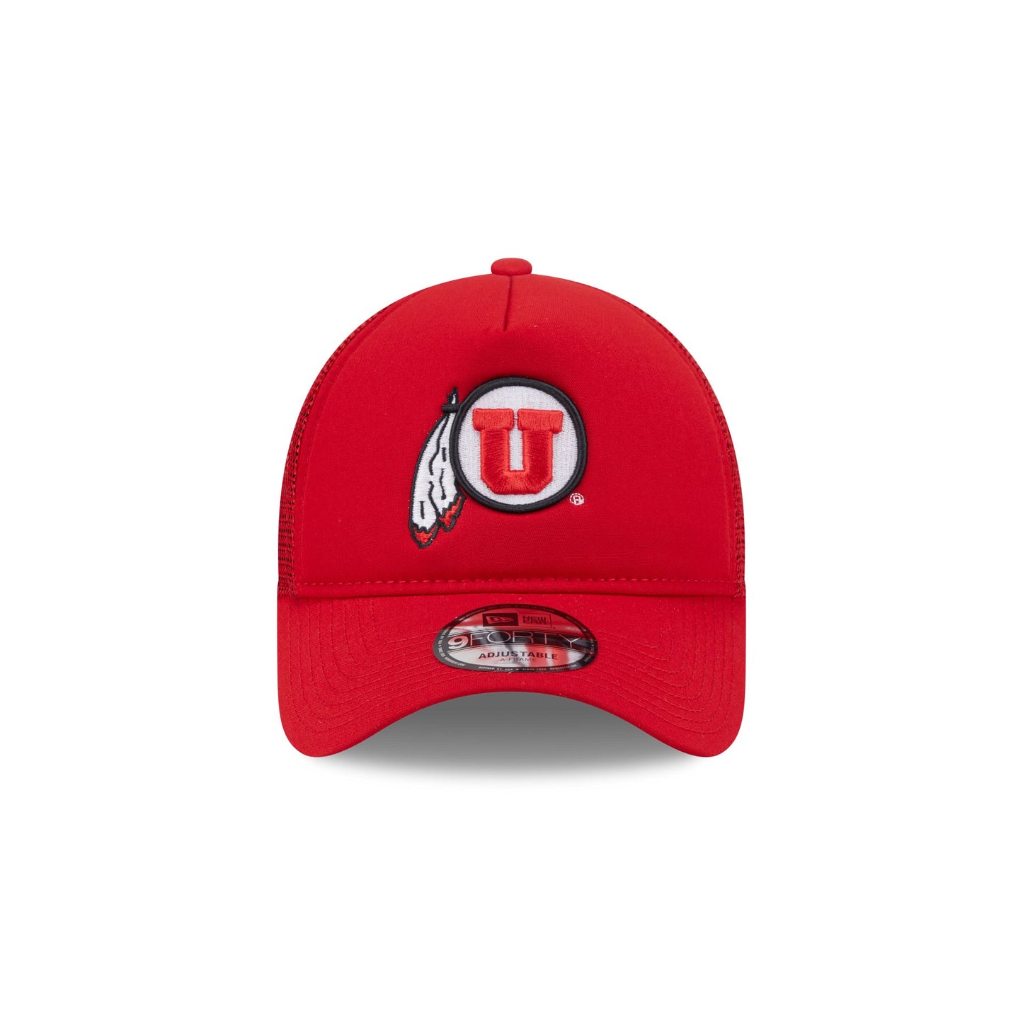 The Utah Utes Go-To 9FORTY A-Frame Trucker features an embroidered Utes logo at the front panels with a snapback closure at a mesh rear.