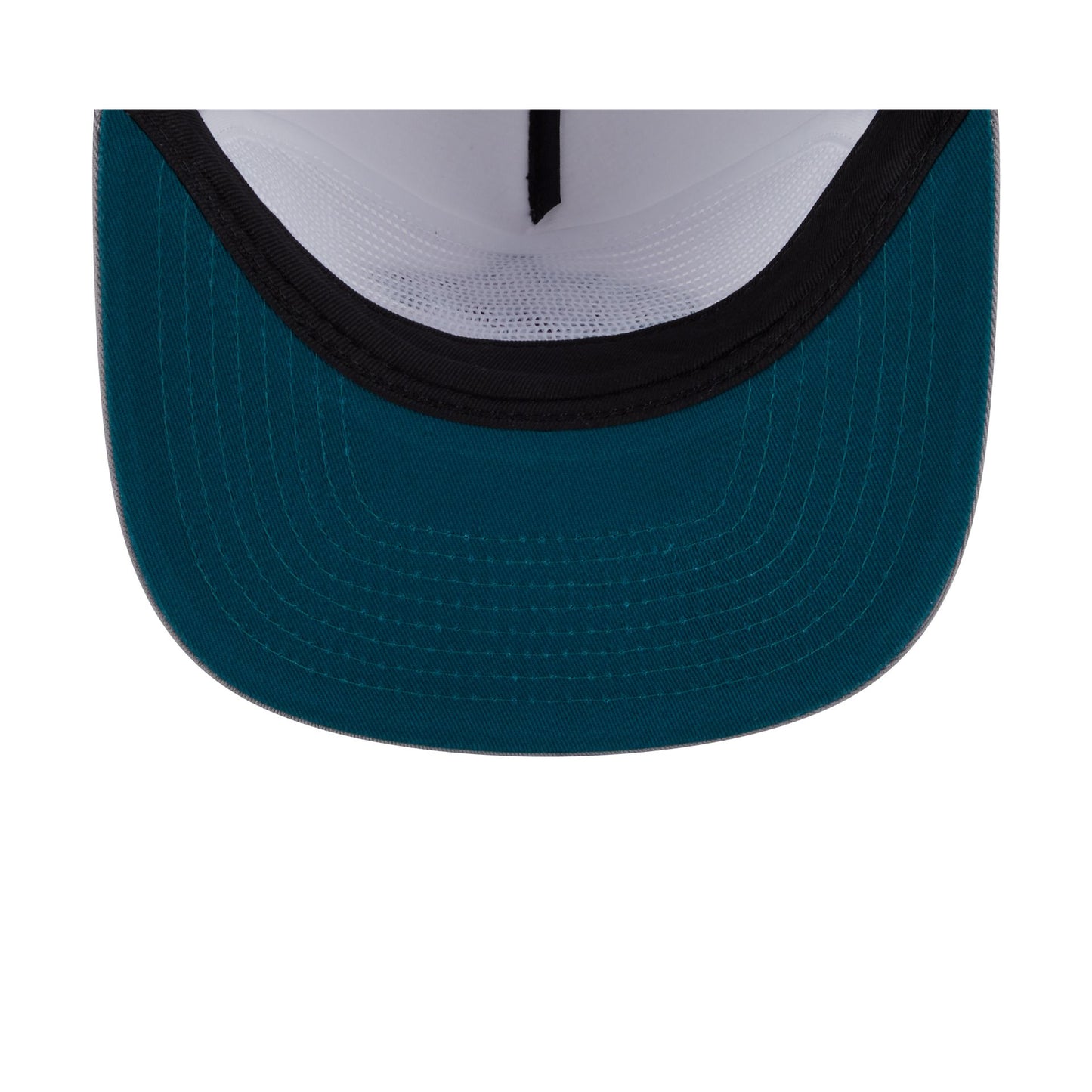 The Vancouver Canucks Optic White Golfer features an embroidered Canucks logo at the front panels with a matching team wordmark at the right-wear side. Additional details include a snapback closure at the rear and a teal undervisor.