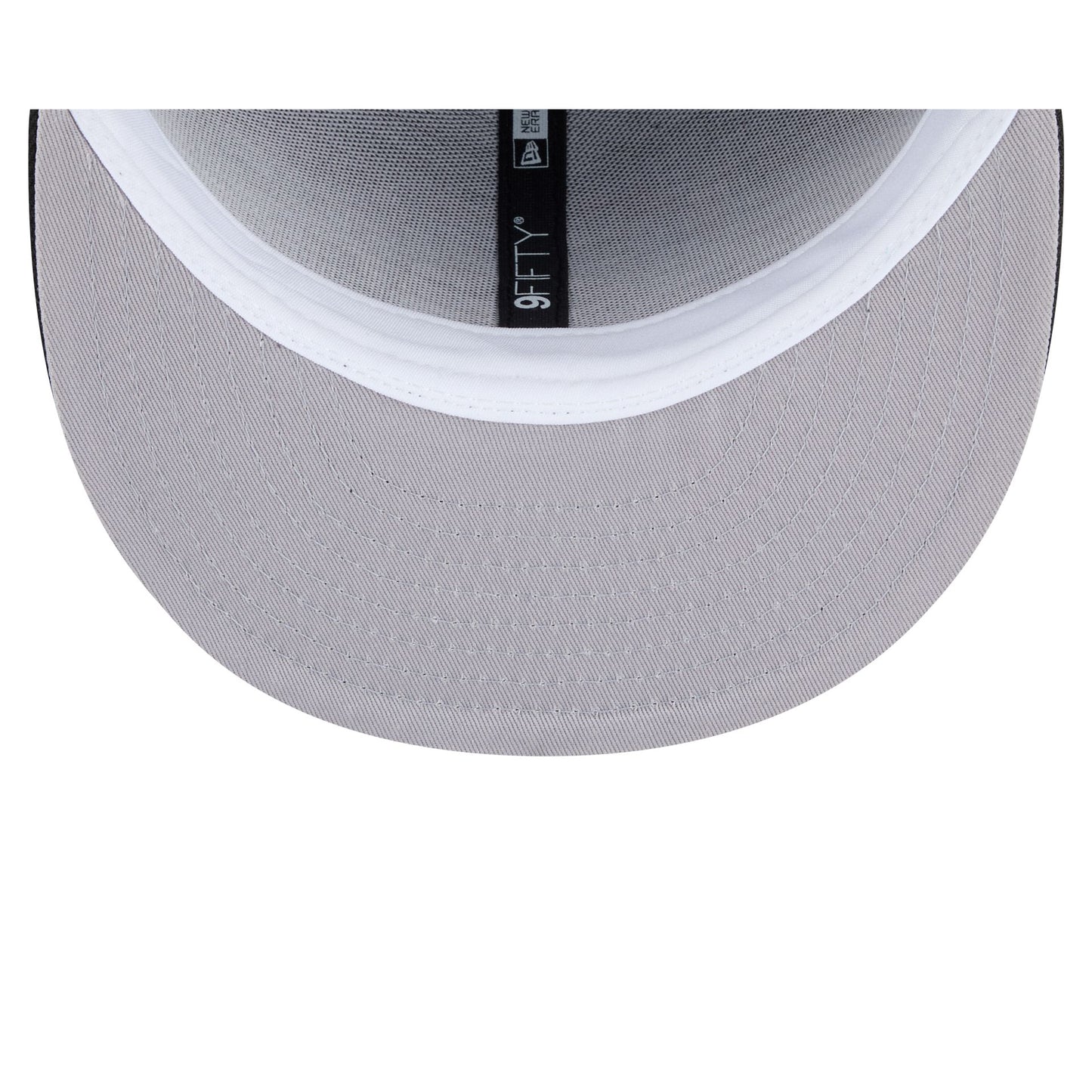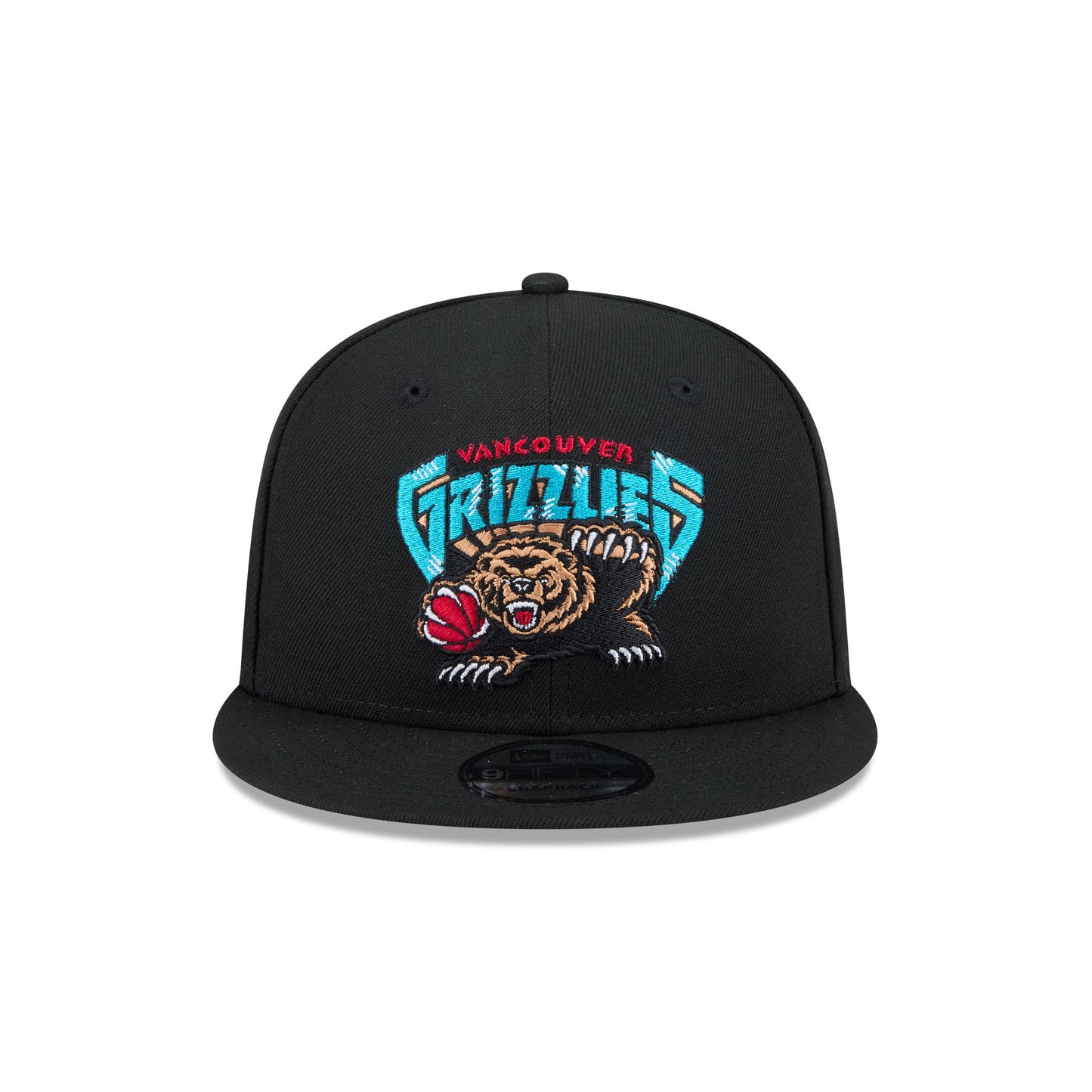 The Vancouver Grizzlies 1995-2001 Hardwood Classics 9FIFTY Snapback features an embroidered vintage Grizzlies logo at the front panels with the NBA Logoman at the right-wear side. Additional details include an adjustable snapback closure at the rear and a gray undervisor.