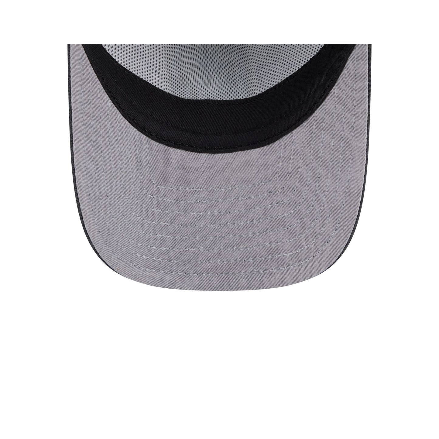 The Vegas Golden Knights Banner 9FIFTY A-Frame Trucker features a embroidered Golden Knights logo at the front panels against a screen-printed stripe at the front panels. Additional details include a snapback closure at a mesh rear and a gray undervisor.