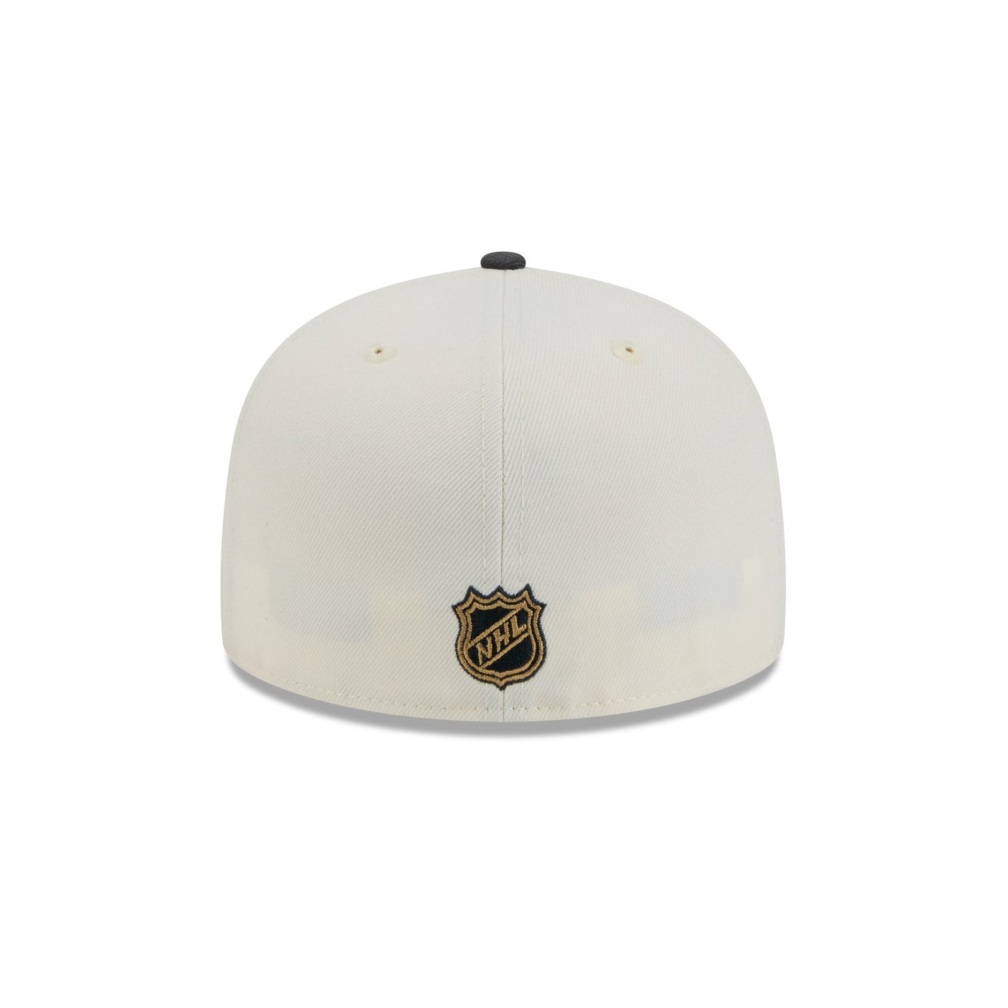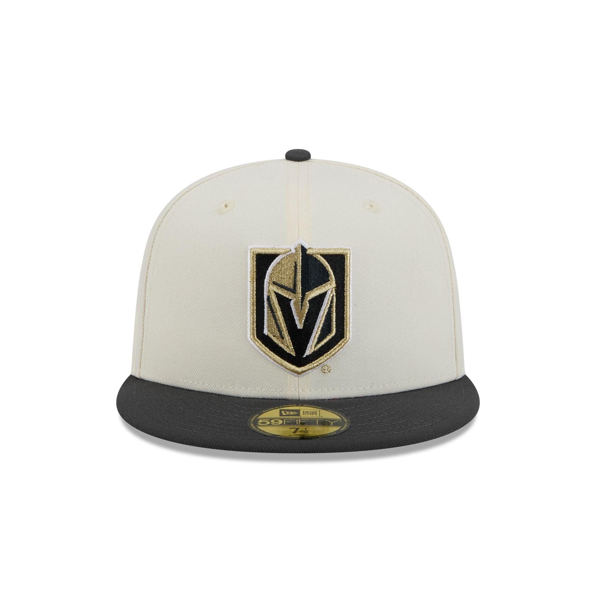The Vegas Golden Knights Chrome White 59FIFTY Fitted Cap features an embroidered Golden Knights logo at the front panels with a matching NHL Shield at the rear and a gray undervisor.