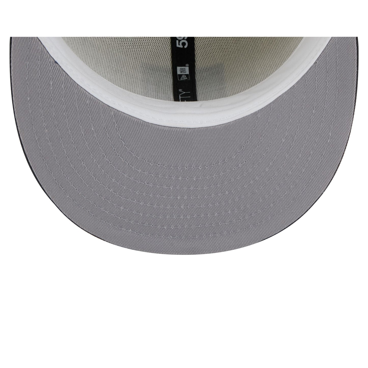The Vegas Golden Knights Chrome White 59FIFTY Fitted Cap features an embroidered Golden Knights logo at the front panels with a matching NHL Shield at the rear and a gray undervisor.