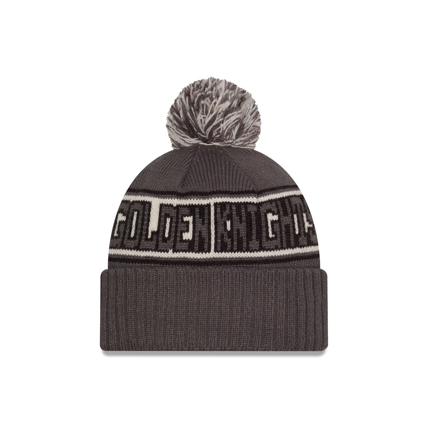 The Vegas Golden Knights Retro Pom Knit Hat features an embroidered Golden Knights logo at the front cuff with a team wordmark at the crown and a one-time removable pom.