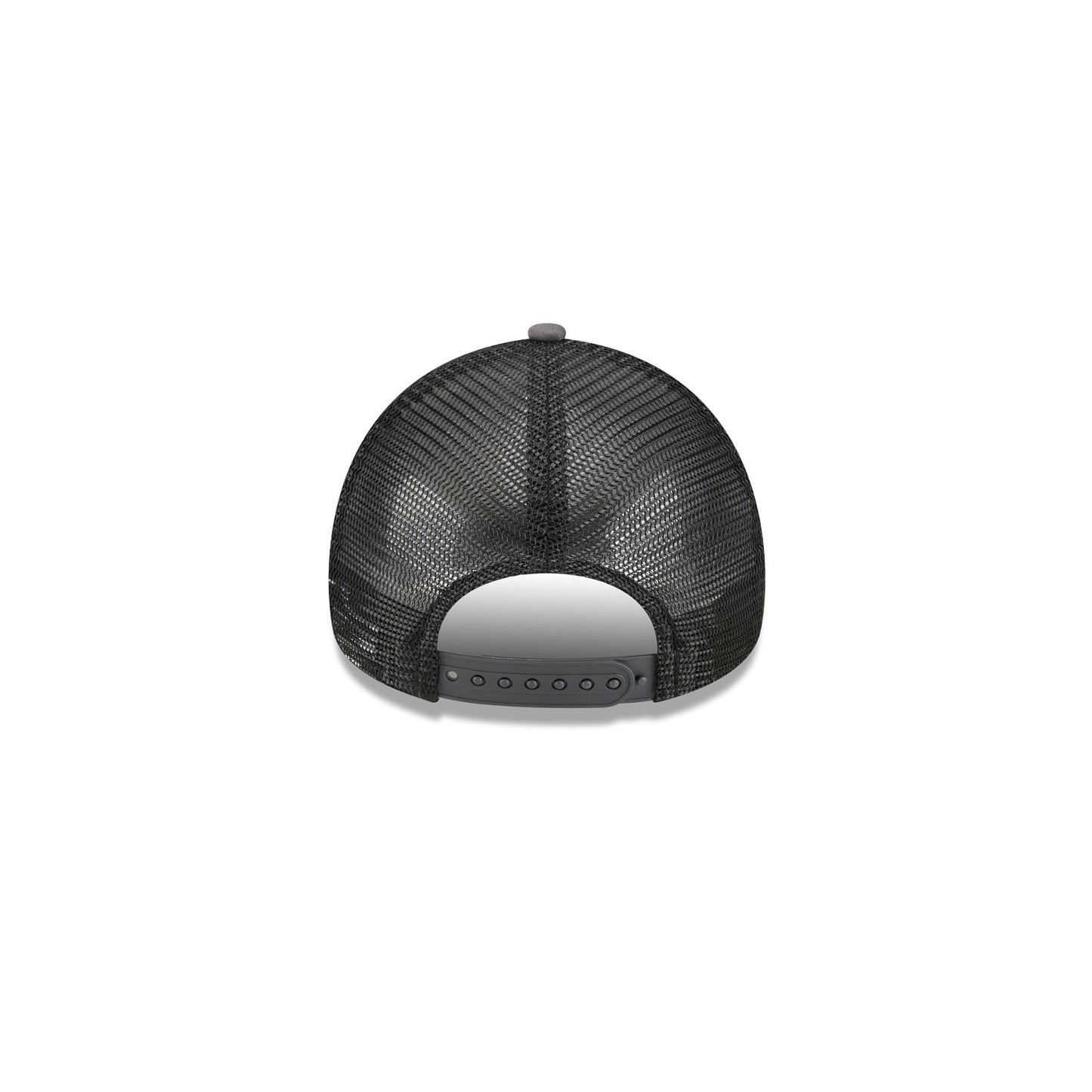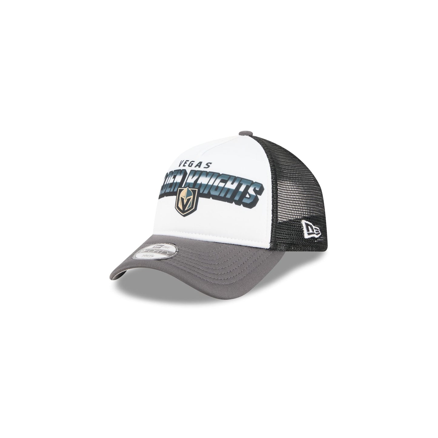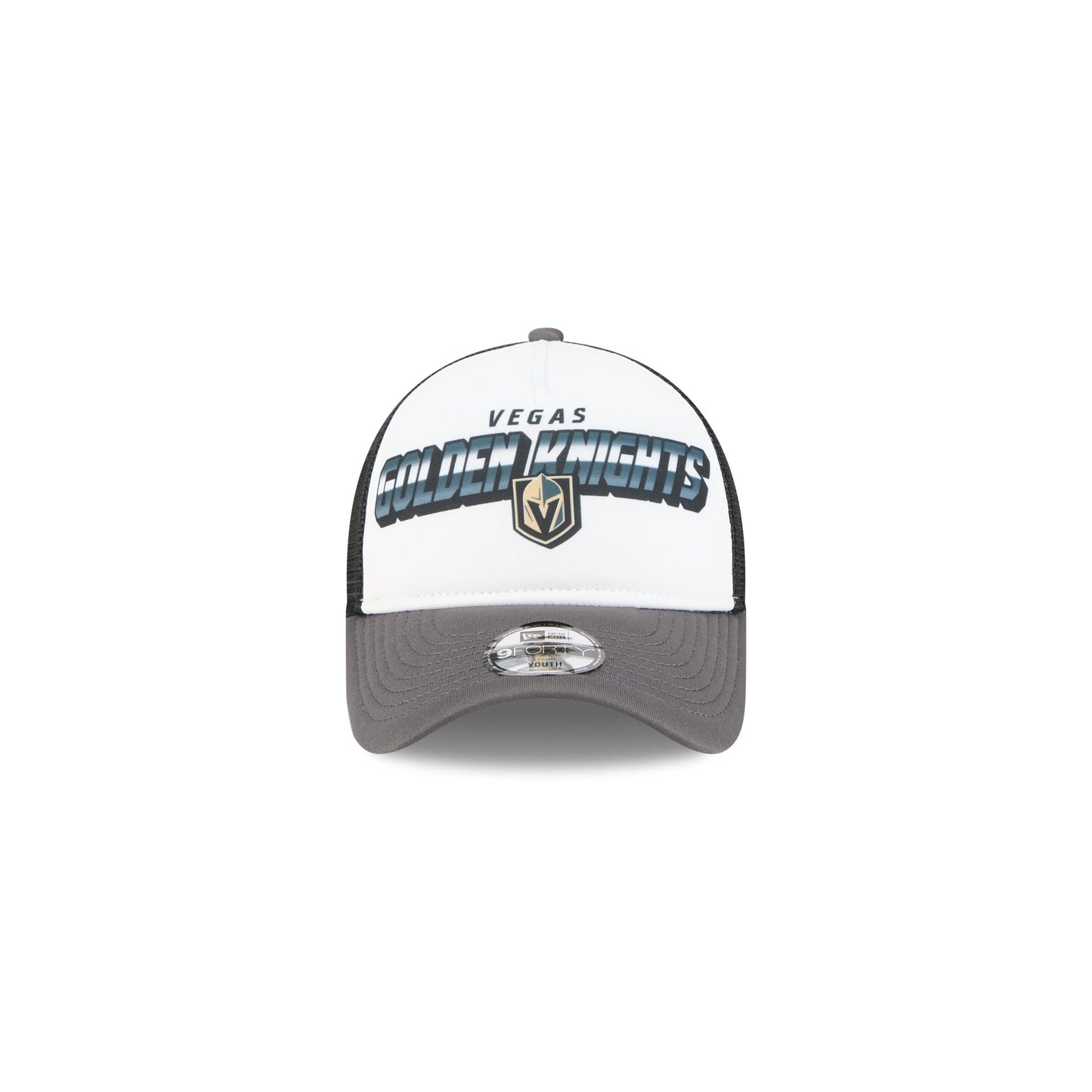 The Vegas Golden Knights Shine Kids 9FORTY A-Frame Trucker features a screen-printed Golden Knights graphic at the front panels with an adjustable snapback closure at a mesh rear.