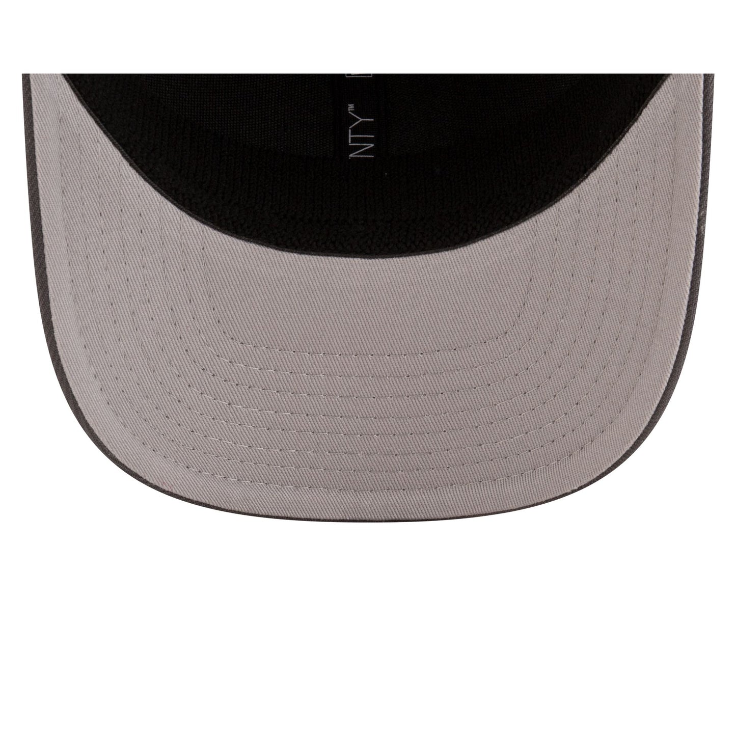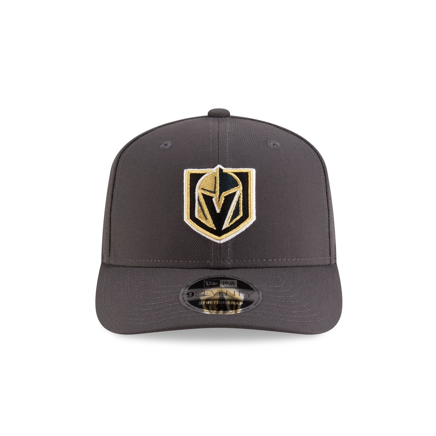 The Vegas Golden Knights Team 9SEVENTY Stretch-Snap Cap features an embroidered Golden Knights logo at the front panels with the NHL Shield logo above an adjustable stretch-snap closure at the rear and a gray undervisor.