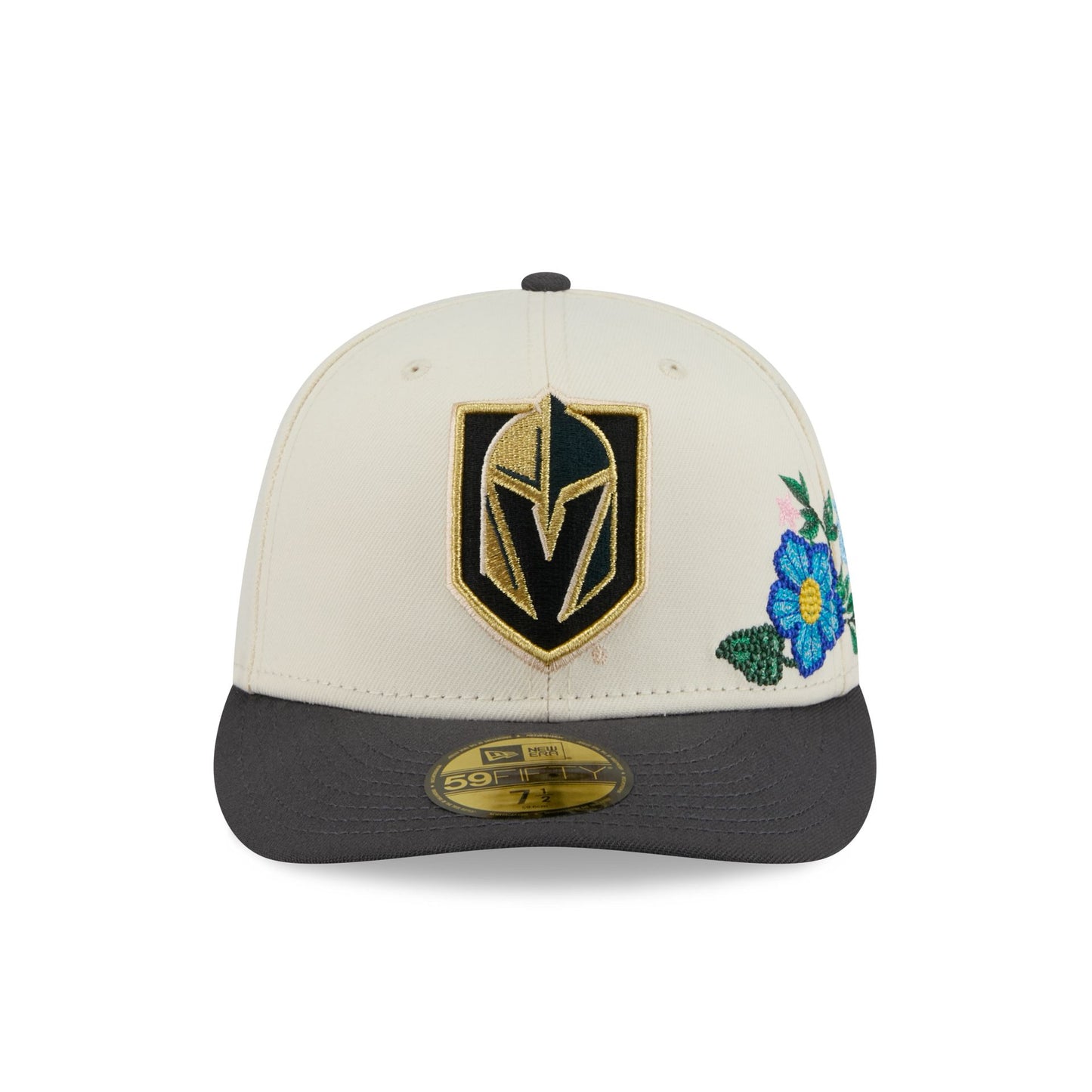 The Vegas Golden Knights Tonal Florals White Pre-Curved 59FIFTY Fitted Cap features an embroidered Golden Knights logo at the front panels with a team color visor and a green undervisor. Additional details include chainstitched embroidered flowers with handstitched beading at the left-wear side and a matching NHL Shield at the rear.