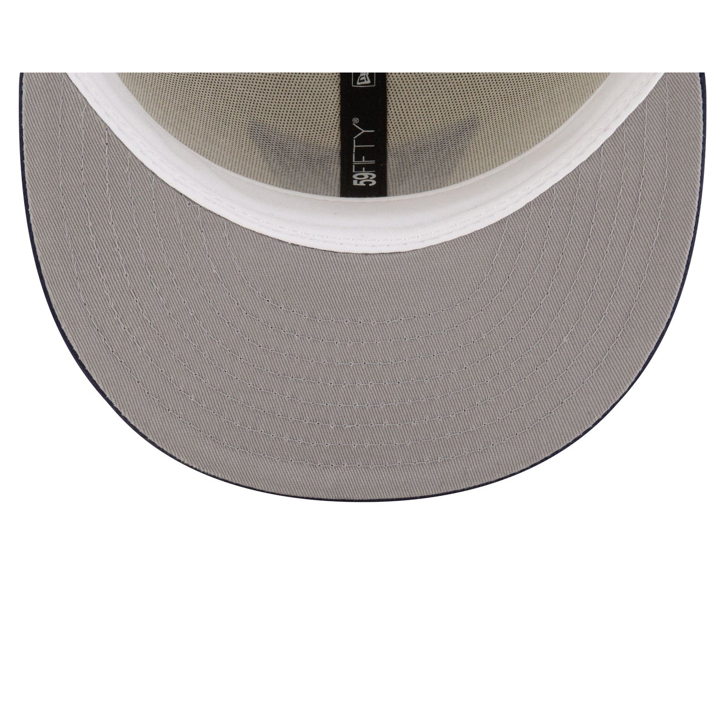 The Villanova Wildcats White 59FIFTY Fitted Cap features an embroidered Wildcats logo at the front panels with a matching team mascot at the rear. Additional details include a 1985 NCAA Championship patch at the right-wear side, a navy visor, and a gray undervisor.