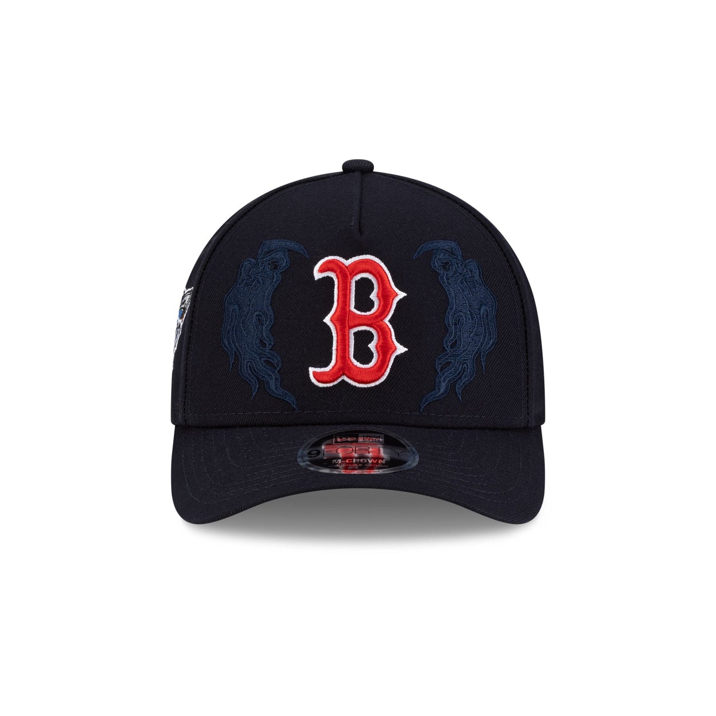 The Warren Lotas x Boston Red Sox 9FORTY M-Crown A-Frame Snapback features an embroidered Red Sox logo at the front panels with graphics at each side. Additional details include a Warren Lotas patch at the right-wear side, an adjustable snapback closure at the rear, and a gray undervisor.