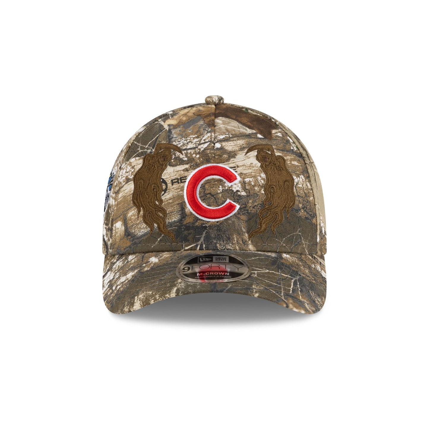 The Warren Lotas x Chicago Cubs Realtree 9FORTY M-Crown A-Frame Snapback features an embroidered Cubs logo at the front panels with graphics at each side. Additional details include a Warren Lotas patch at the right-wear side, an adjustable snapback closure at the rear, and a gray undervisor.
