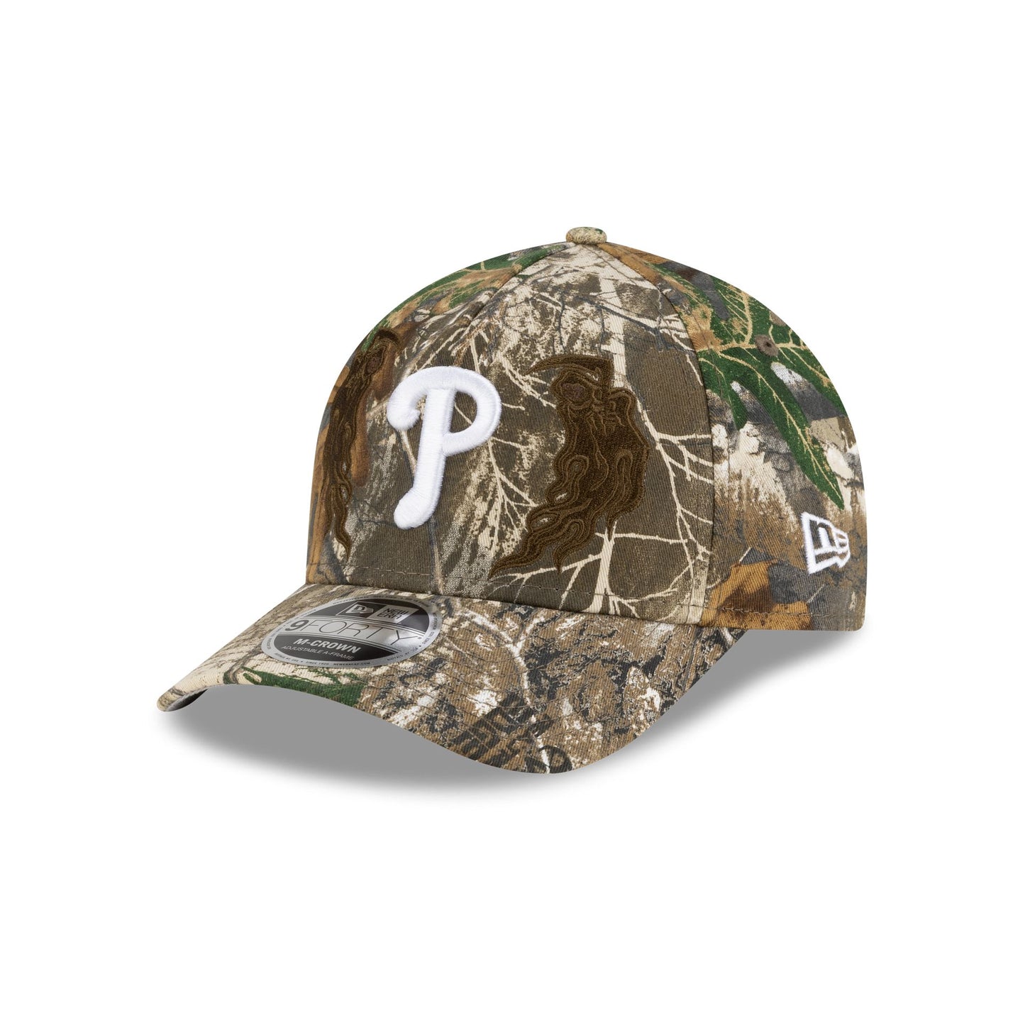 The Warren Lotas x Philadelphia Phillies Realtree 9FORTY M-Crown A-Frame Snapback features an embroidered Phillies logo at the front panels with graphics at each side. Additional details include a Warren Lotas patch at the right-wear side, an adjustable snapback closure at the rear, and a gray undervisor.