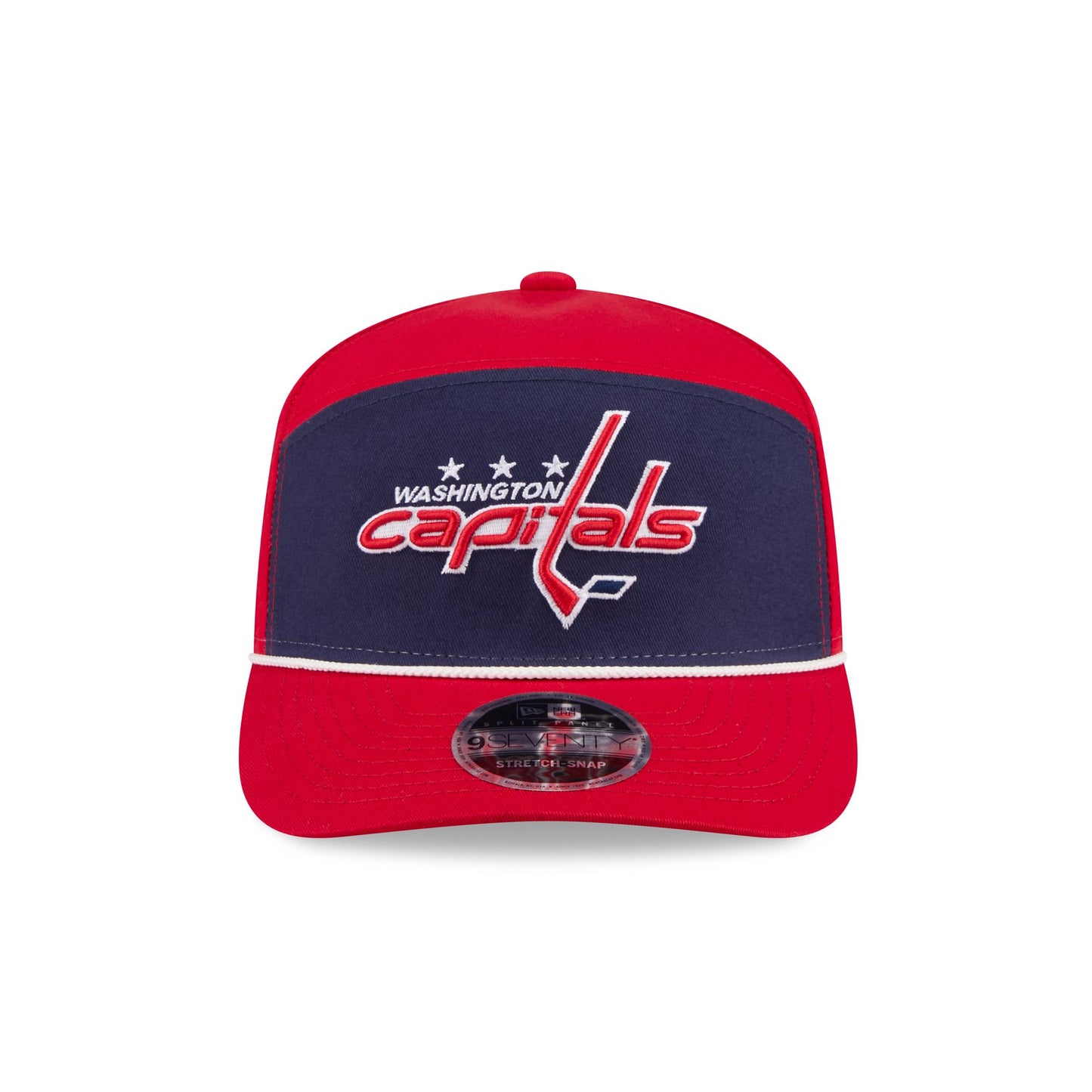 The Washington Capitals Split Panel 9SEVENTY Stretch-Snap features an embroidered Capitals logo at the front panel with a split crown construction and a rope at the visor. Additional details include an adjustable stretch-snap closure at the rear and a gray undervisor.