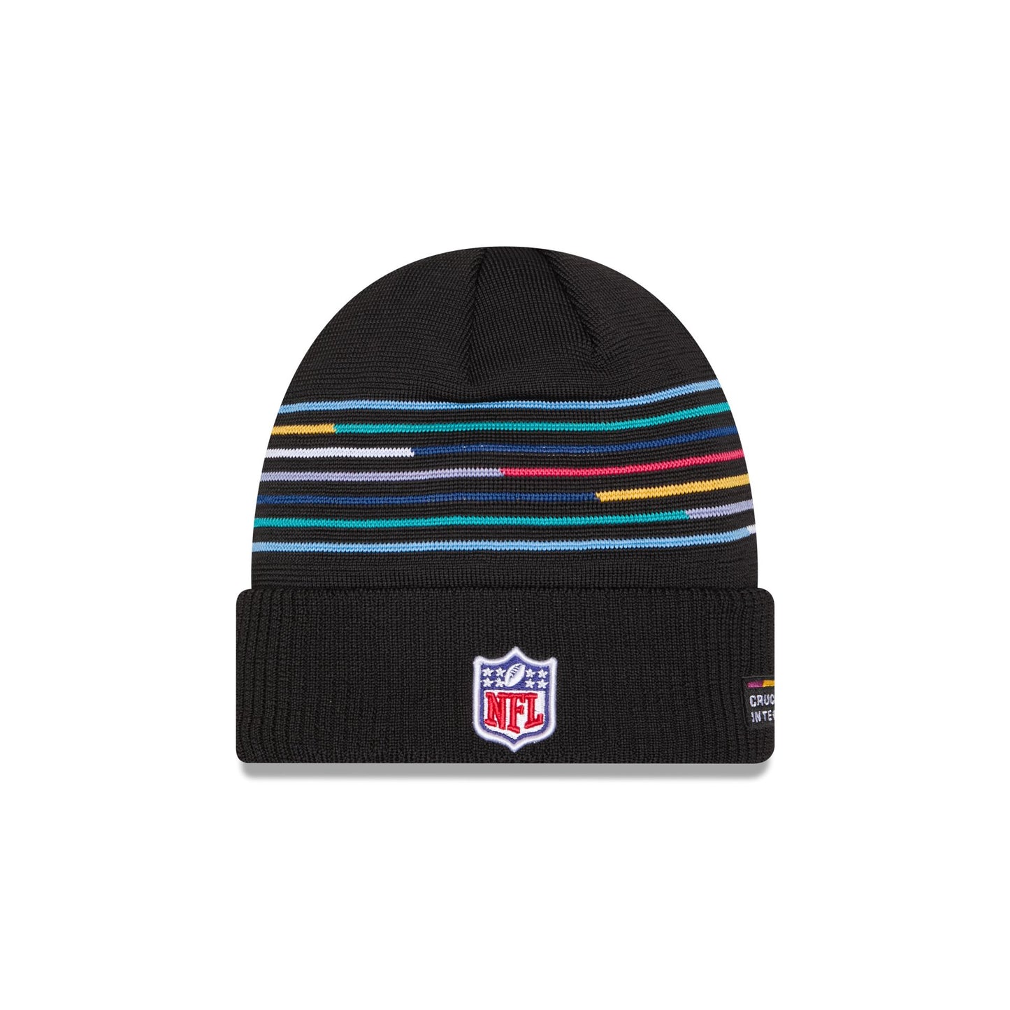 The Washington Commanders 2025 Crucial Catch Cuff Knit features an embroidered Commanders logo at the front with matching colored stripes at the crown, an NFL Shield at the rear, and a Crucial Catch Intercept Cancer patch at the right-wear side.