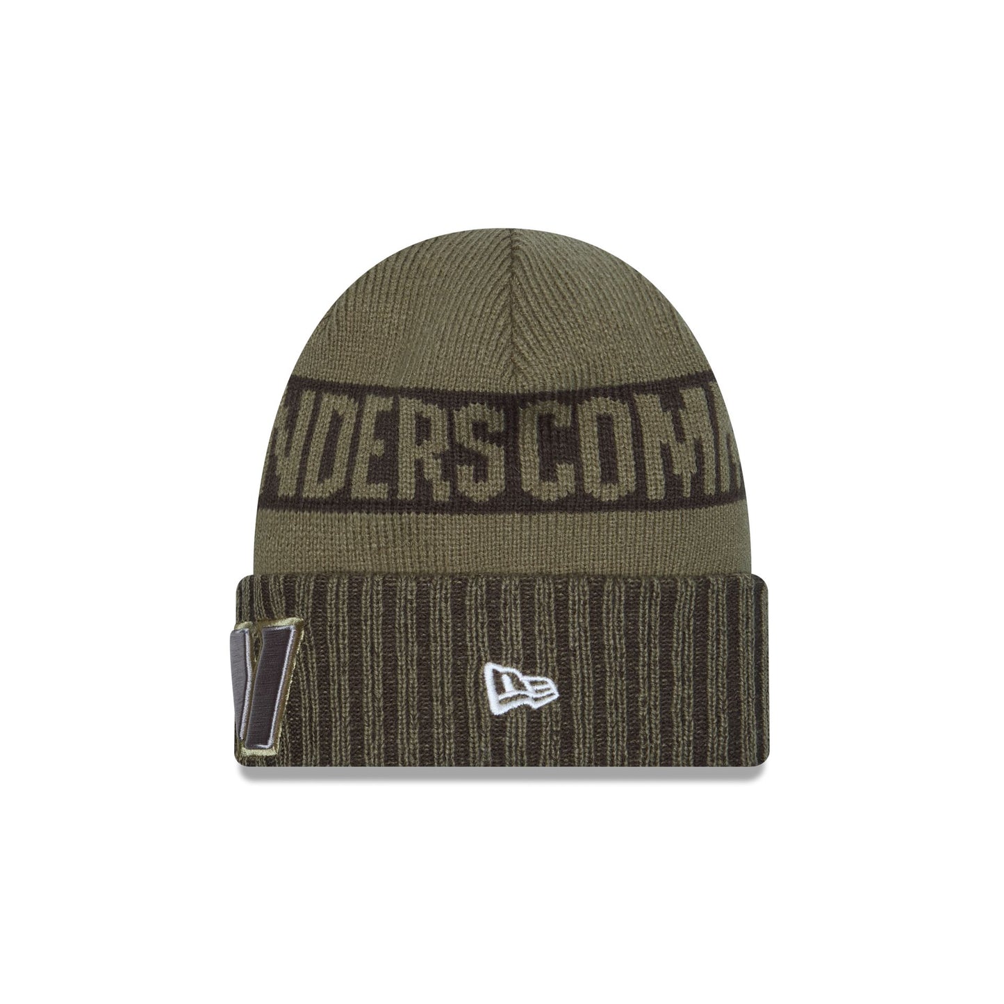 The Washington Commanders 2025 Salute to Service Cuff Knit features an embroidered Commanders logo at the front with a team wordmark at the crown, an American flag patch at the right-wear side, and the official NFL Salute to Service patch at the rear.