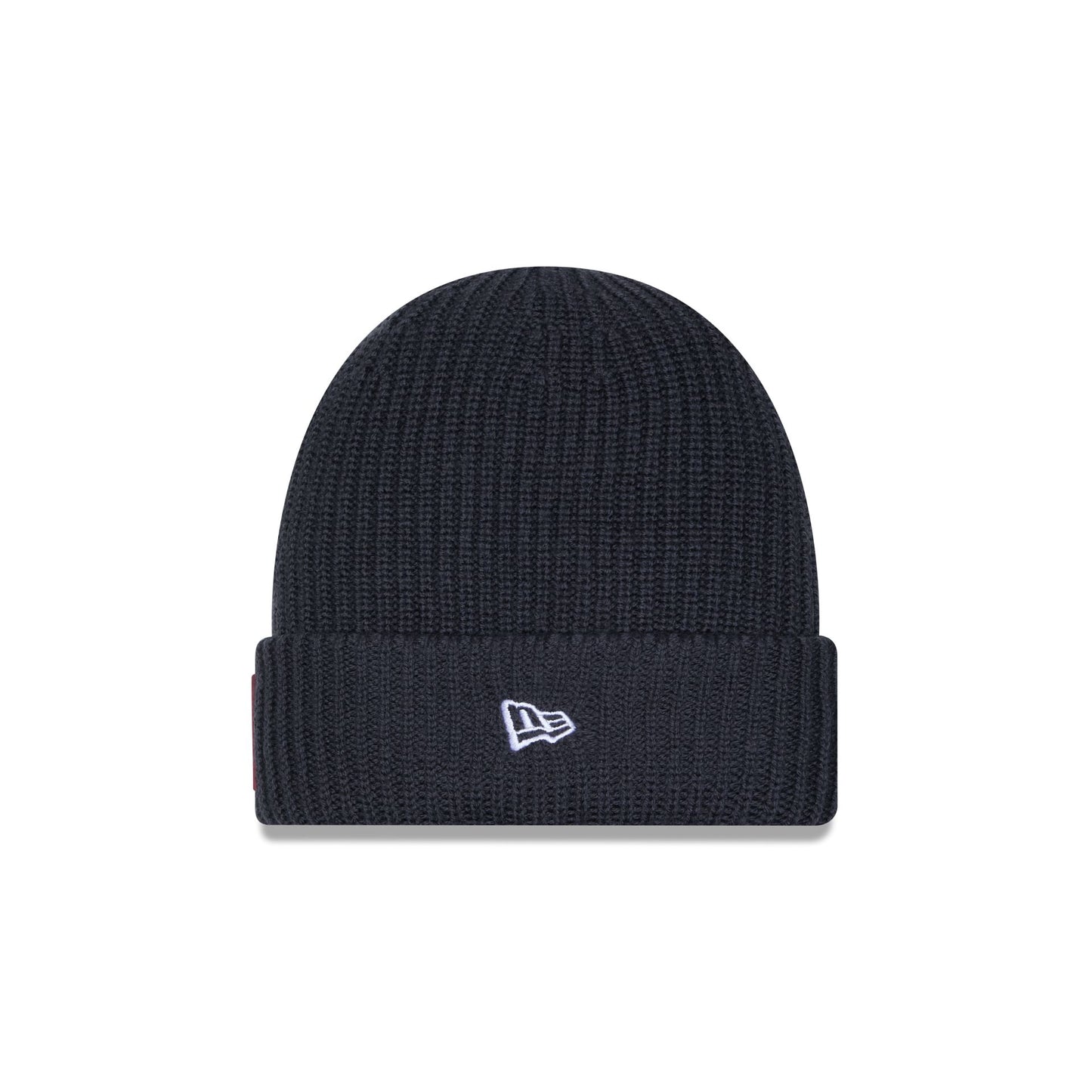 The Washington Commanders 2025 Sideline Cold Weather Steel Clouds Cuff Knit Beanie features a sewn-down silicone Commanders logo patch at the front cuff with a matching Official NFL Shield logo at the rear. The beanie is knit from wool yarn and lined with fleece.