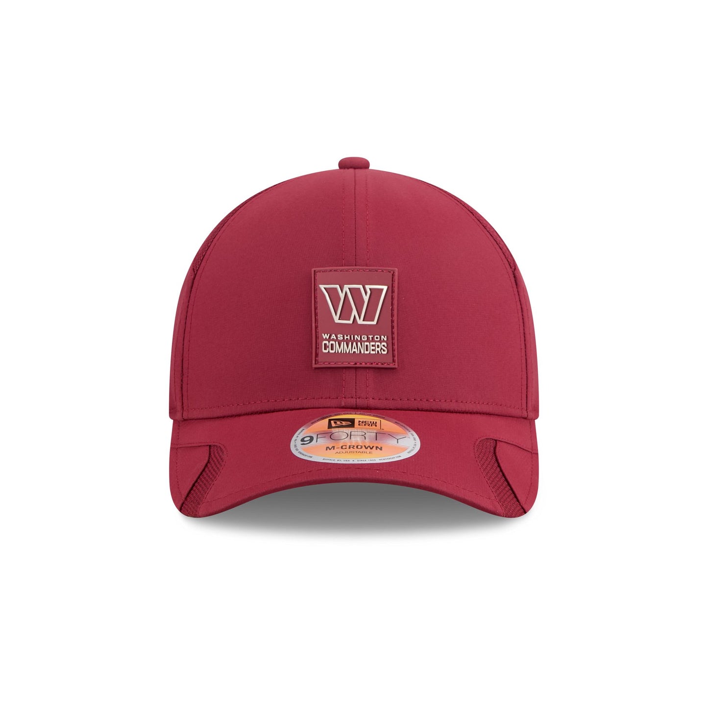 The Washington Commanders 2025 Sideline Hot Weather 9FORTY M-Crown Snapback features a sewn-down silicone Commanders logo patch at the front panels with a water-repellent quill tech fabrication throughout and a quick-dry cushioned sweatband to absorb moisture. Additional details include the Official NFL Shield logo to the right of a soft silicone snapback closure at the rear and mesh accents at the visor sides and side crown panels. The undervisor is accented with a silicone transfer in the team’s colors.