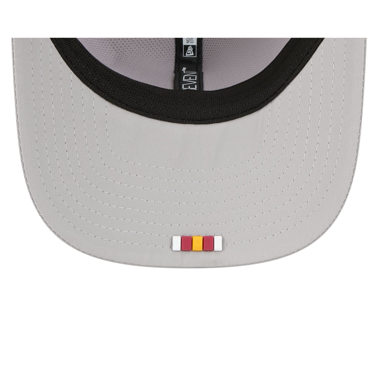 The Washington Commanders 2025 Sideline Hot Weather Gray 9SEVENTY Trucker features a sewn-down silicone Commanders logo patch at the front panels with a water-repellent quill tech fabrication throughout and a quick-dry cushioned sweatband to absorb moisture. Additional details include the Official NFL Shield logo to the right of a soft silicone snapback closure at a light-weight mesh rear. The undervisor is accented with a silicone transfer in the team’s colors.