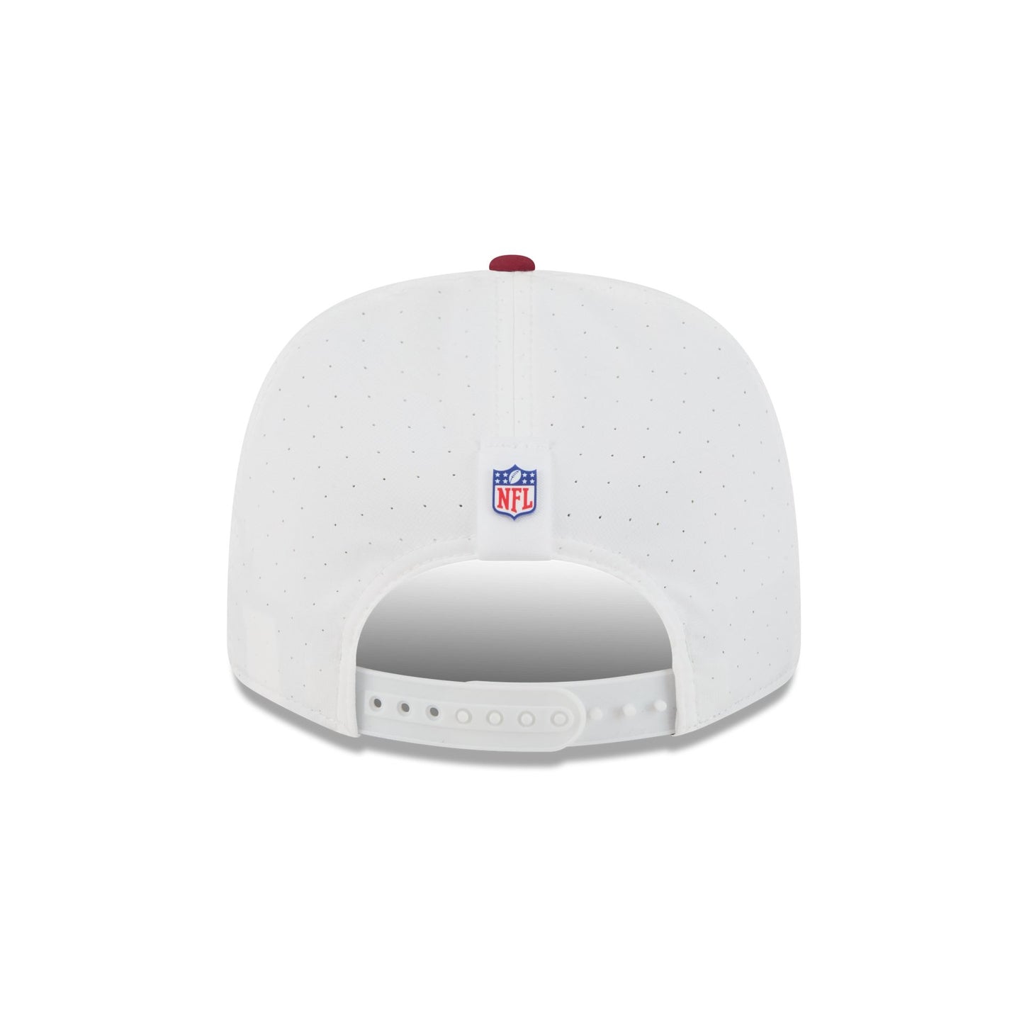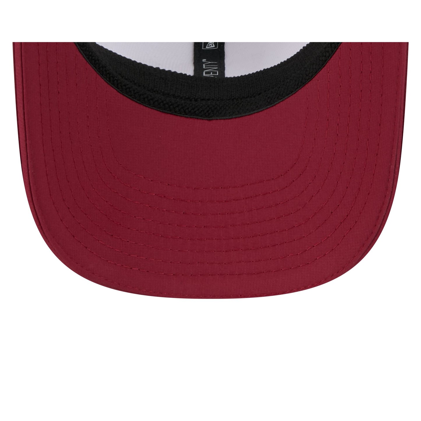 The Washington Commanders 2025 Training 9SEVENTY Stretch-Snap Cap features a silicone Commanders patch at the front panels with team color stripes at the front of a red visor. Additional details include a silicone NFL Shield patch on a woven foldover tab above a snapback closure at the rear.