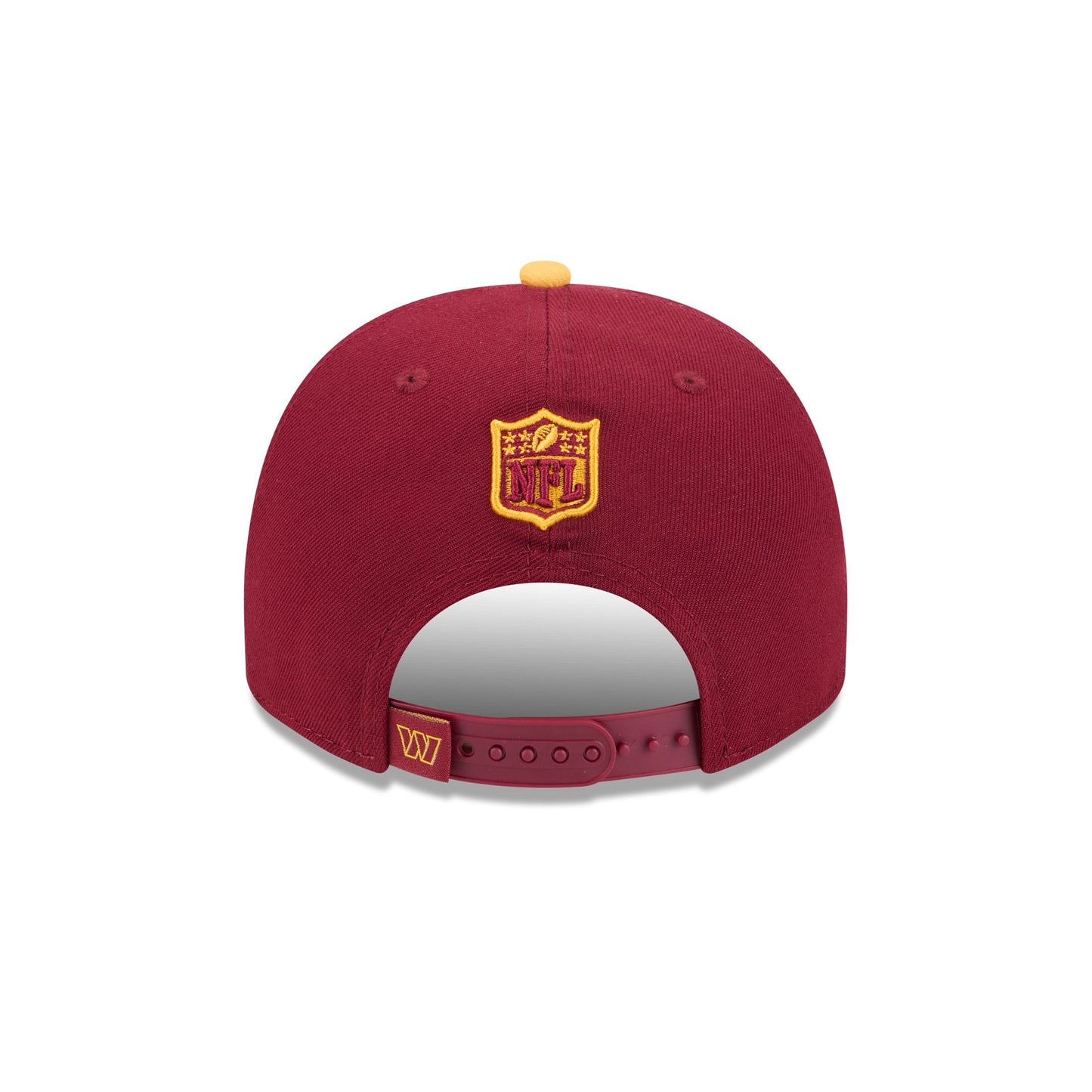 The Washington Commanders Cartoon 9FIFTY A-Frame Snapback features an embroidered Commanders cartoon themed logo at the front with a matching NFL Shield above a snapback closure at the rear. Additional details include a monochromatic embroidered team logo at the right-wear side and a gray undervisor.