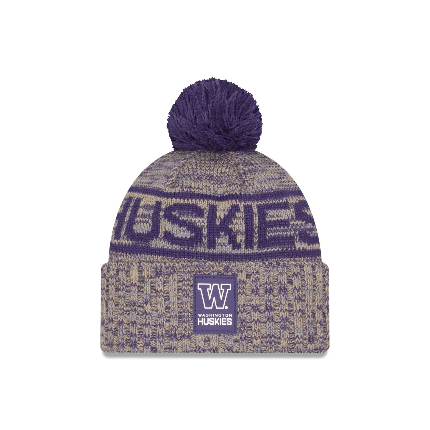 The Washington Huskies Cold Weather Pom Knit features a sewn-down silicone Huskies logo patch at the front cuff with a New Era Flag at the left-wear side. Additional details include a team wordmark across the crown, a one-time removeable pom, and a fleece lining.