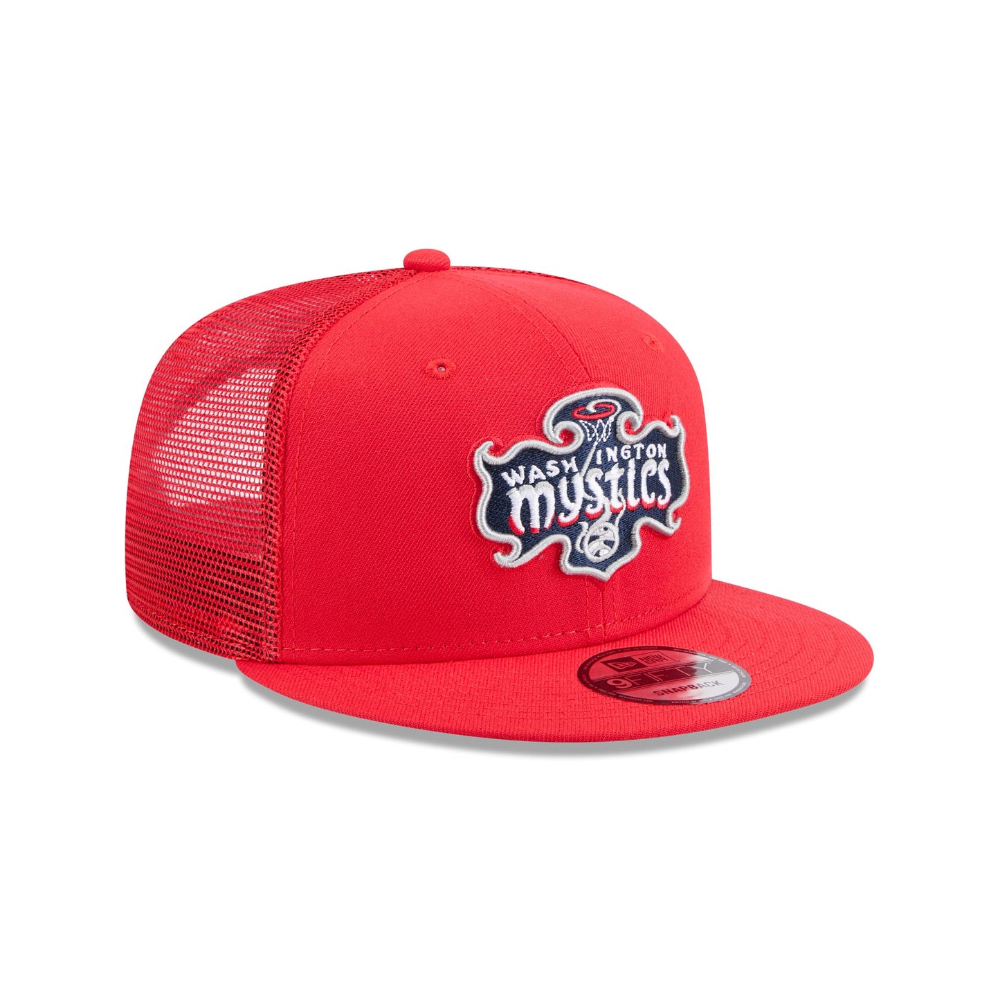 The Washington Mystics 9FIFTY Trucker features an embroidered Mystics logo at the front panels with a matching woven team tag at a snapback closure at the rear and a gray undervisor.