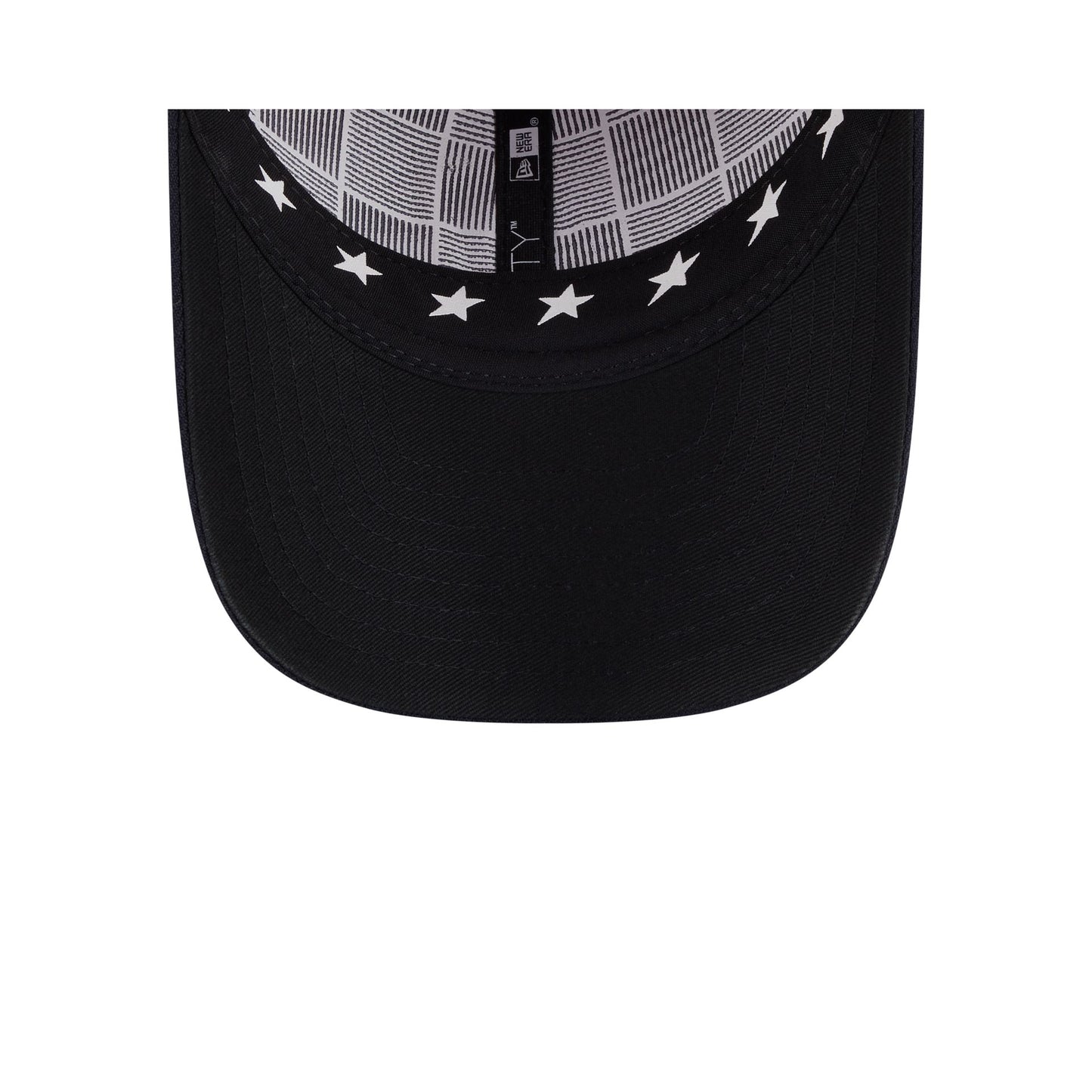 The Washington Nationals 2025 All-Star Game 9FORTY M-Crown Snapback features an embroidered Nationals logo and stars at the front panels with breathable mesh fabric at the side and rear panels. Additional details include a 2025 All-Star Game patch at the right-wear side, the MLB Batterman logo above a snapback closure at the rear, and a black undervisor. The cap also features screen-printed stars on the sweatband.