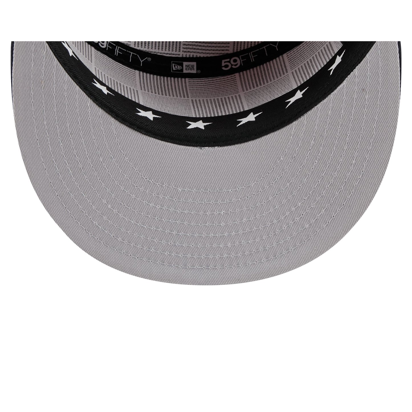 The Washington Nationals 2025 All-Star Game Split Panel 59FIFTY Fitted Cap features an embroidered Nationals logo at the front panels against a split-crown construction with breathable mesh fabric at the side and rear panels. Additional details include stars at the top panel, a 2025 All-Star Game patch at the right-wear side, the MLB Batterman logo at the rear, and a gray undervisor. The cap also features screen-printed stars on the sweatband.
