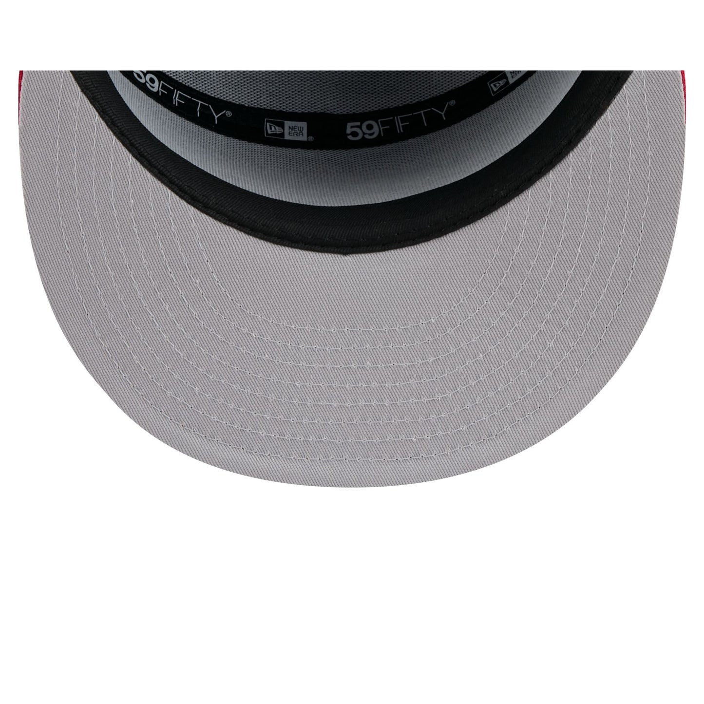 The Washington Nationals 2025 All-Star Game Workout Split Panel 59FIFTY Fitted Cap features an embroidered Nationals logo at the front panels against a split-crown construction with breathable mesh fabric at the side and rear panels. Additional details include stars at the top panel, a 2025 All-Star Game patch at the right-wear side, the MLB Batterman logo at the rear, and a gray undervisor.