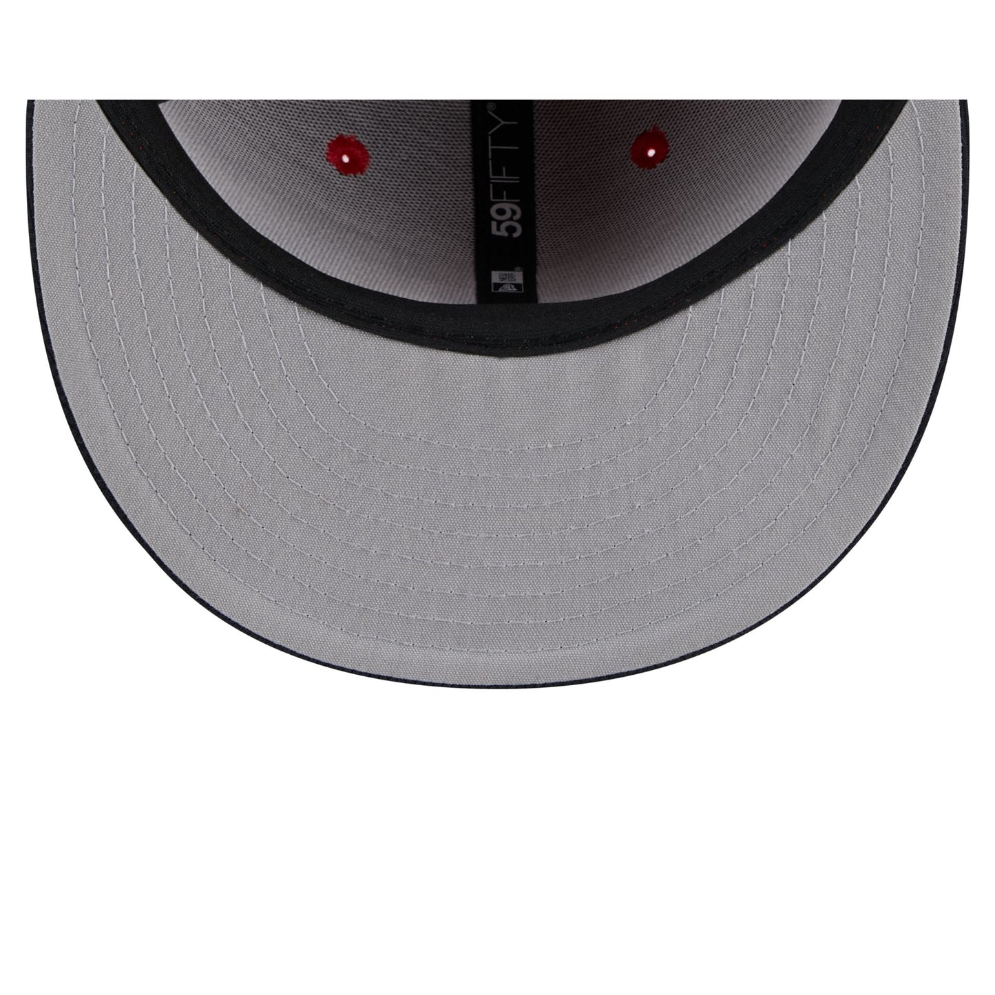 The Washington Nationals 2025 Batting Practice 59FIFTY Fitted Cap features an embroidered Nationals logo at the front panels with a matching MLB Batterman logo at the rear. Additional details include a pivot knit fabrication, a navy visor, and a gray undervisor.