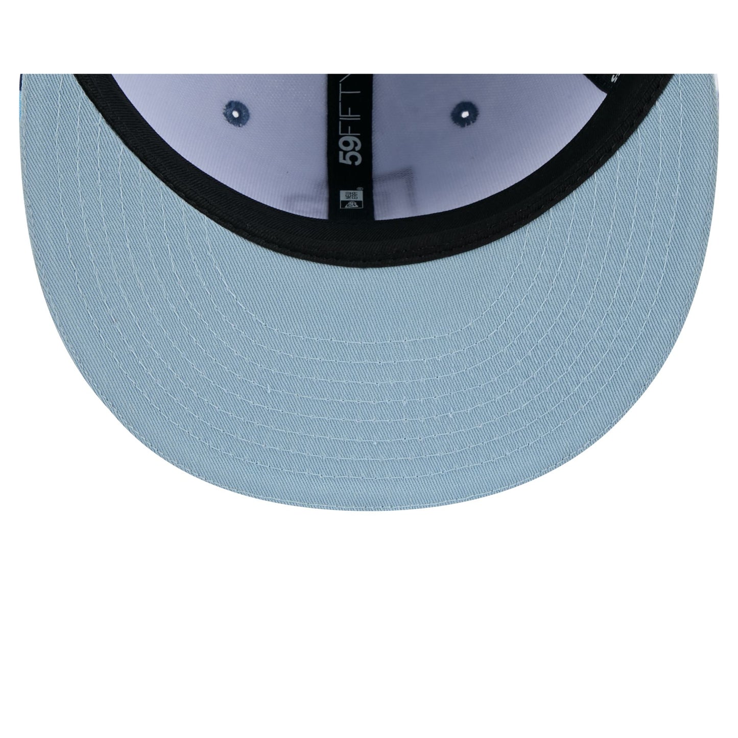 The Washington Nationals City Connect Fan Pack Alt 59FIFTY Fitted Cap features an embroidered Nationals logo at the front panels against a city map design. Additional details include a matching MLB Batterman logo at the rear and a blue undervisor.