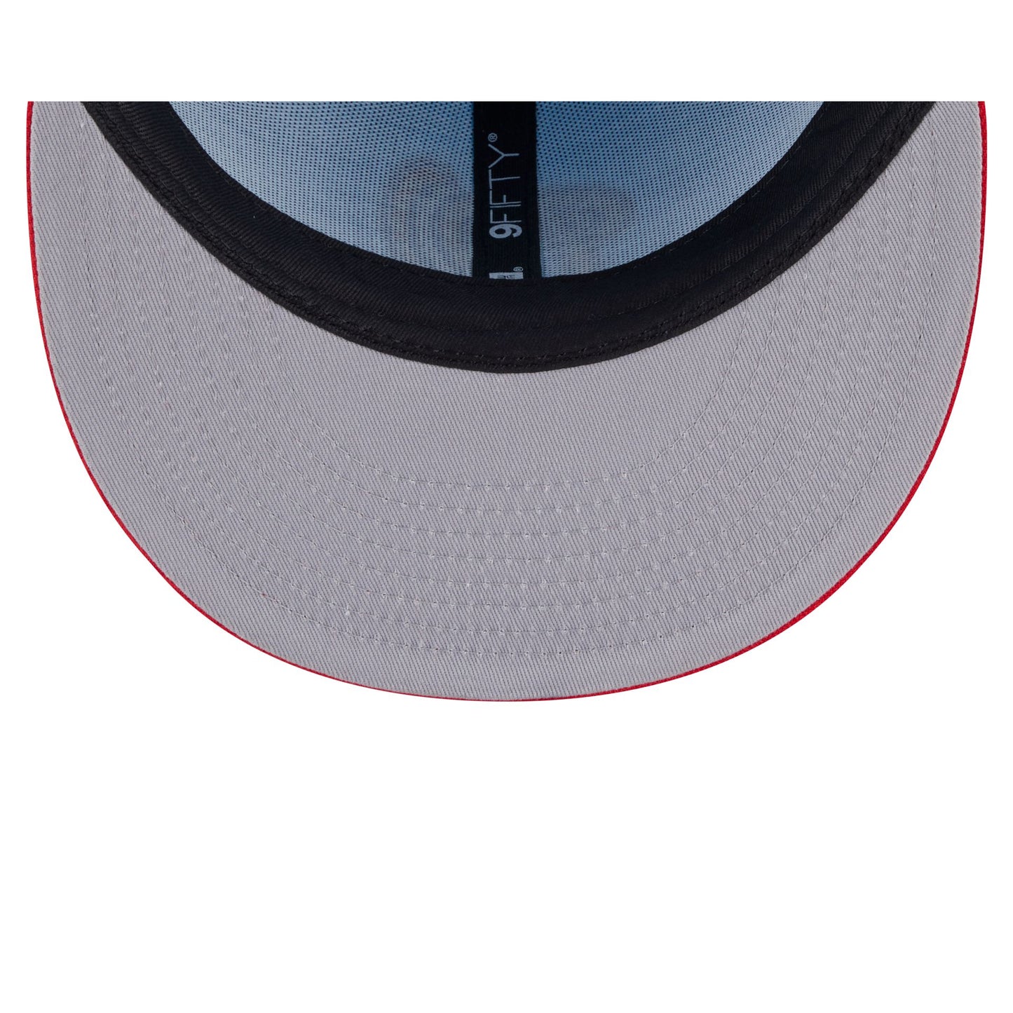 The Washington Nationals Independence Day 2025 9FIFTY Snapback features an embroidered American flag themed Nationals logo at the front panels with a matching MLB Batterman logo above a snapback closure at the rear, a red visor, and a gray undervisor.