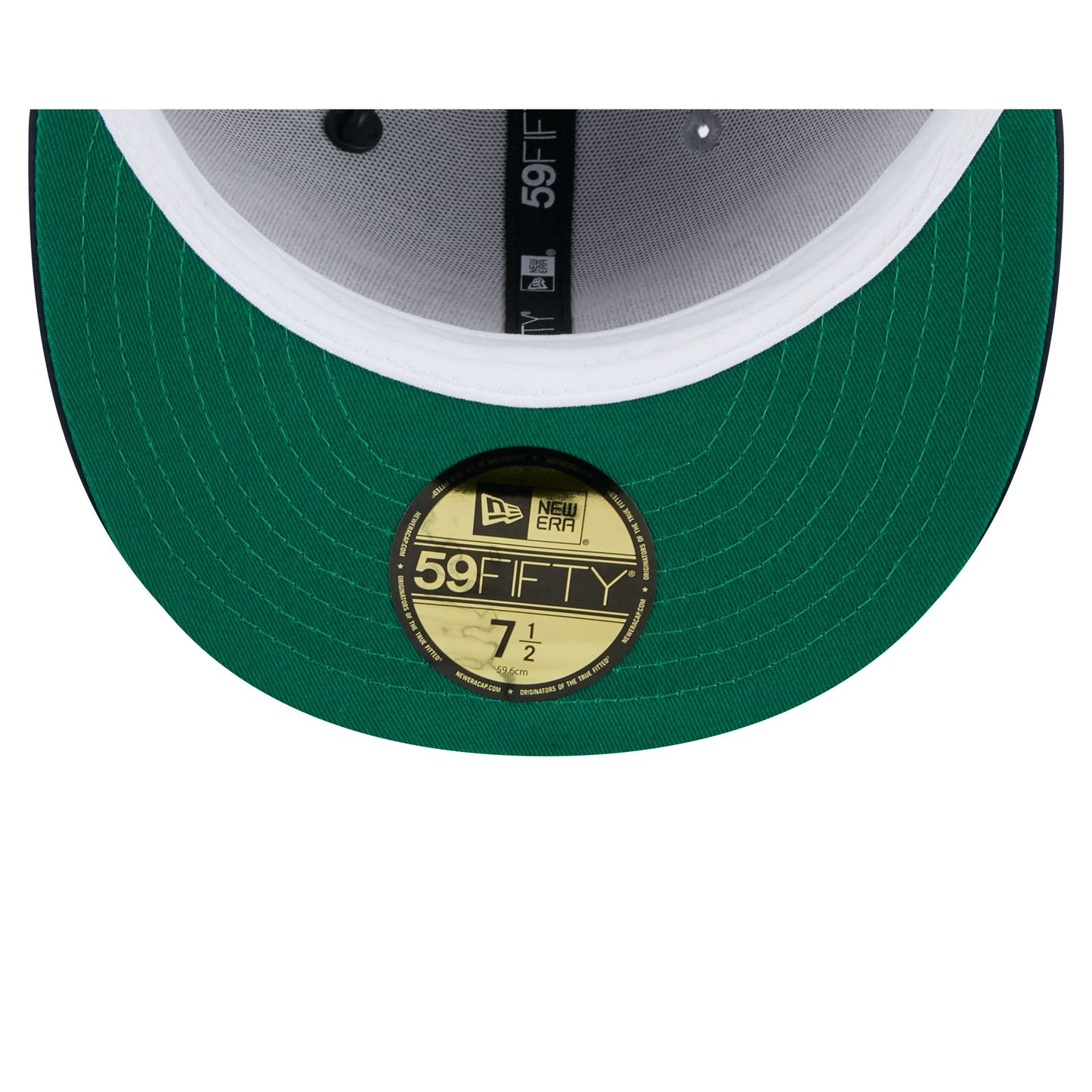 The Washington Nationals Spring Satin 59FIFTY Fitted Cap features an embroidered Nationals wordmark at the front panels with a New Era pin at the top left panel and an MLB Batterman logo at the rear. Additional details include a satin fabrication throughout, a logo at the right-wear side, and a green undervisor.