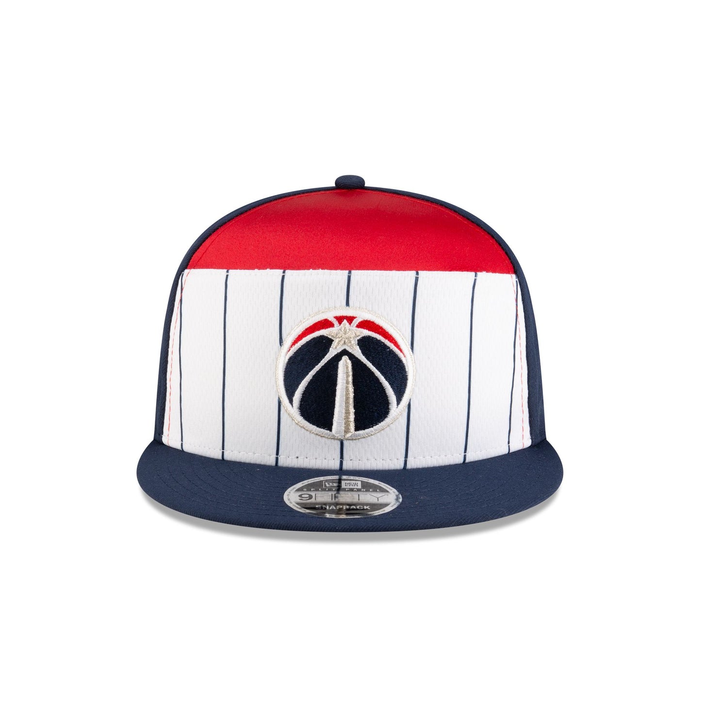The Washington Wizards 2025 Tip-Off Split Panel 9FIFTY Snapback features an embroidered Wizards logo at the front panels against a pinstripe jersey fabrication with the NBA Logoman at the right-wear side. Additional details include an adjustable snapback closure at the rear and a gray undervisor.