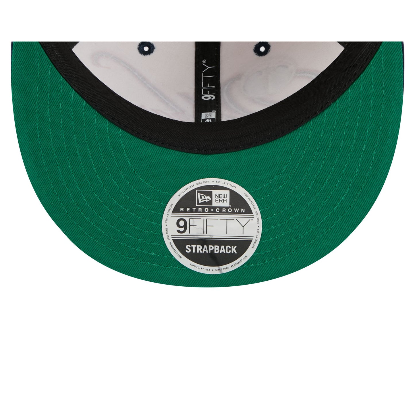 The Washington Wizards Pinstripe Script Retro Crown 9FIFTY Adjustable Cap features an embroidered Wizards logo and cursive wordmark at the front panels wit an adjustable belt closure at the rear and a green undervisor.