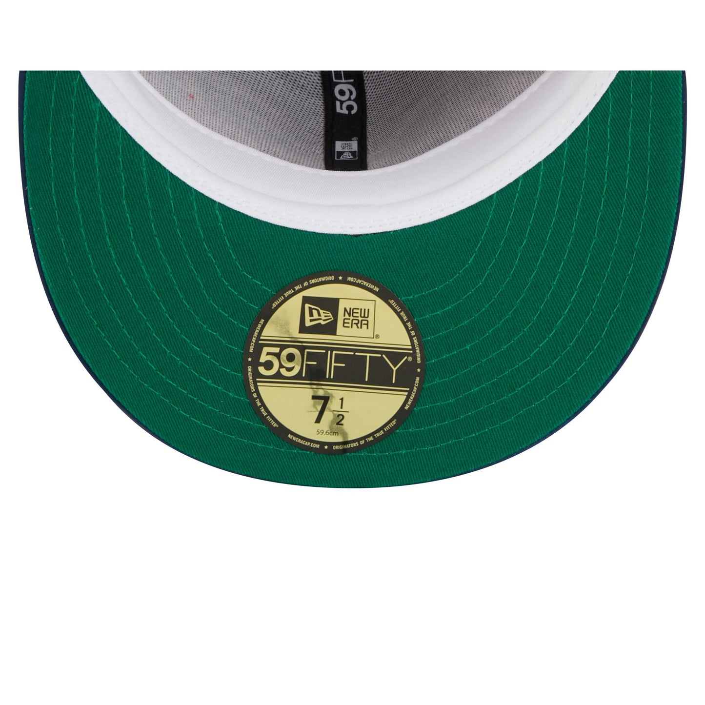 The Washington Wizards Spring Satin 59FIFTY Fitted Cap features an embroidered Wizards wordmark at the front panels with a New Era pin at the top left panel and an NBA Logoman at the rear. Additional details include a satin fabrication throughout, a logo at the right-wear side, and a green undervisor.
