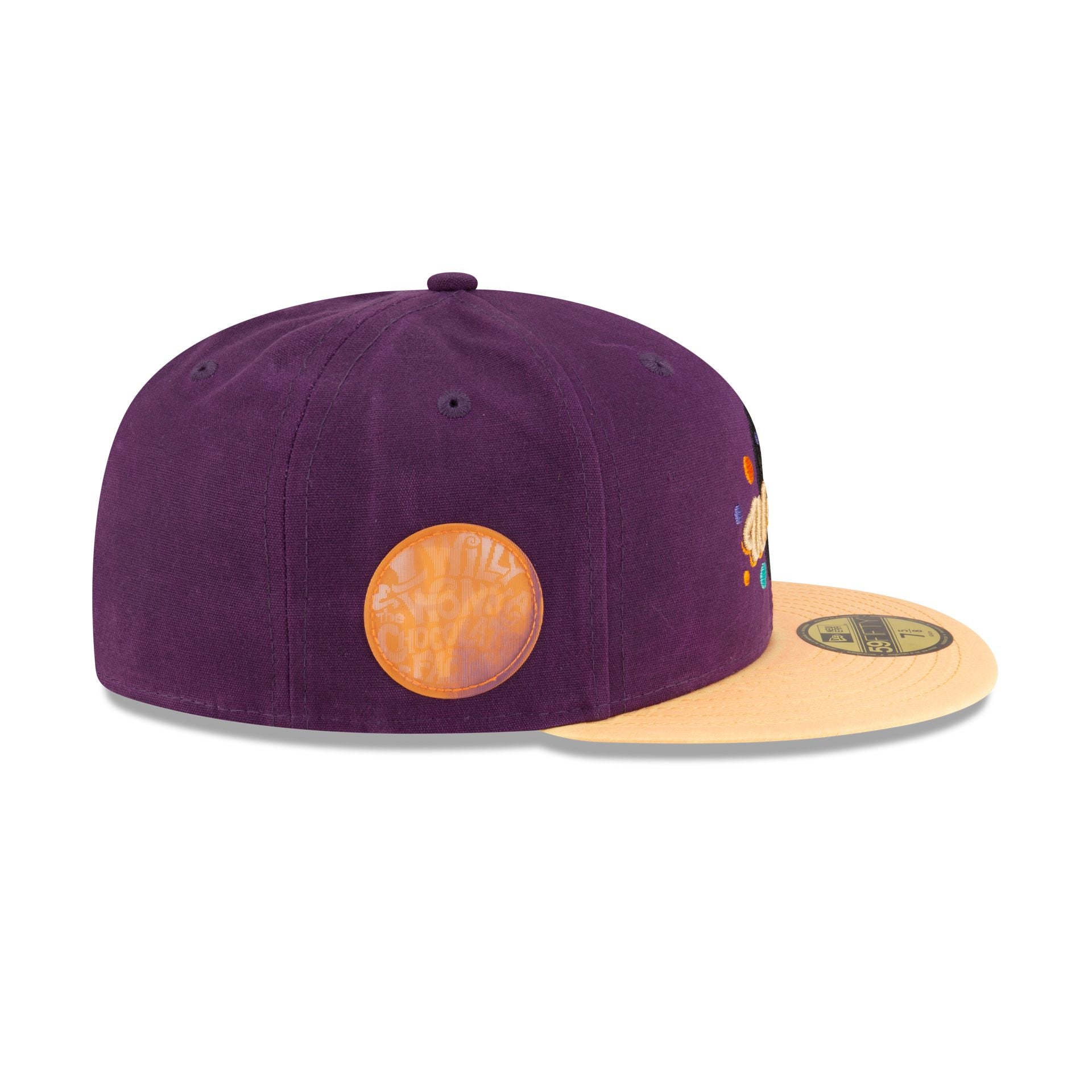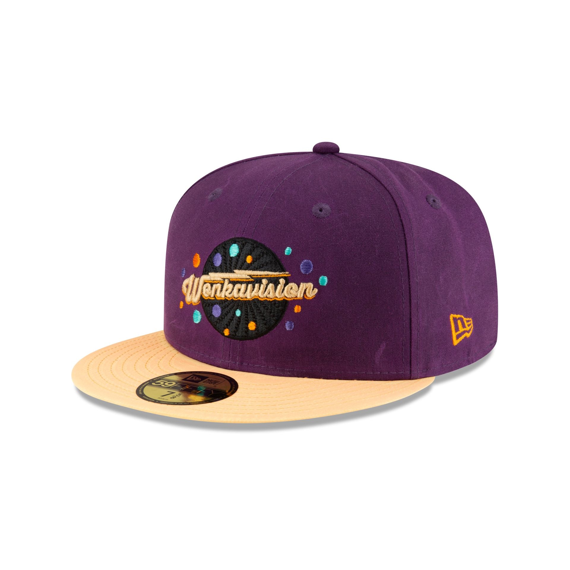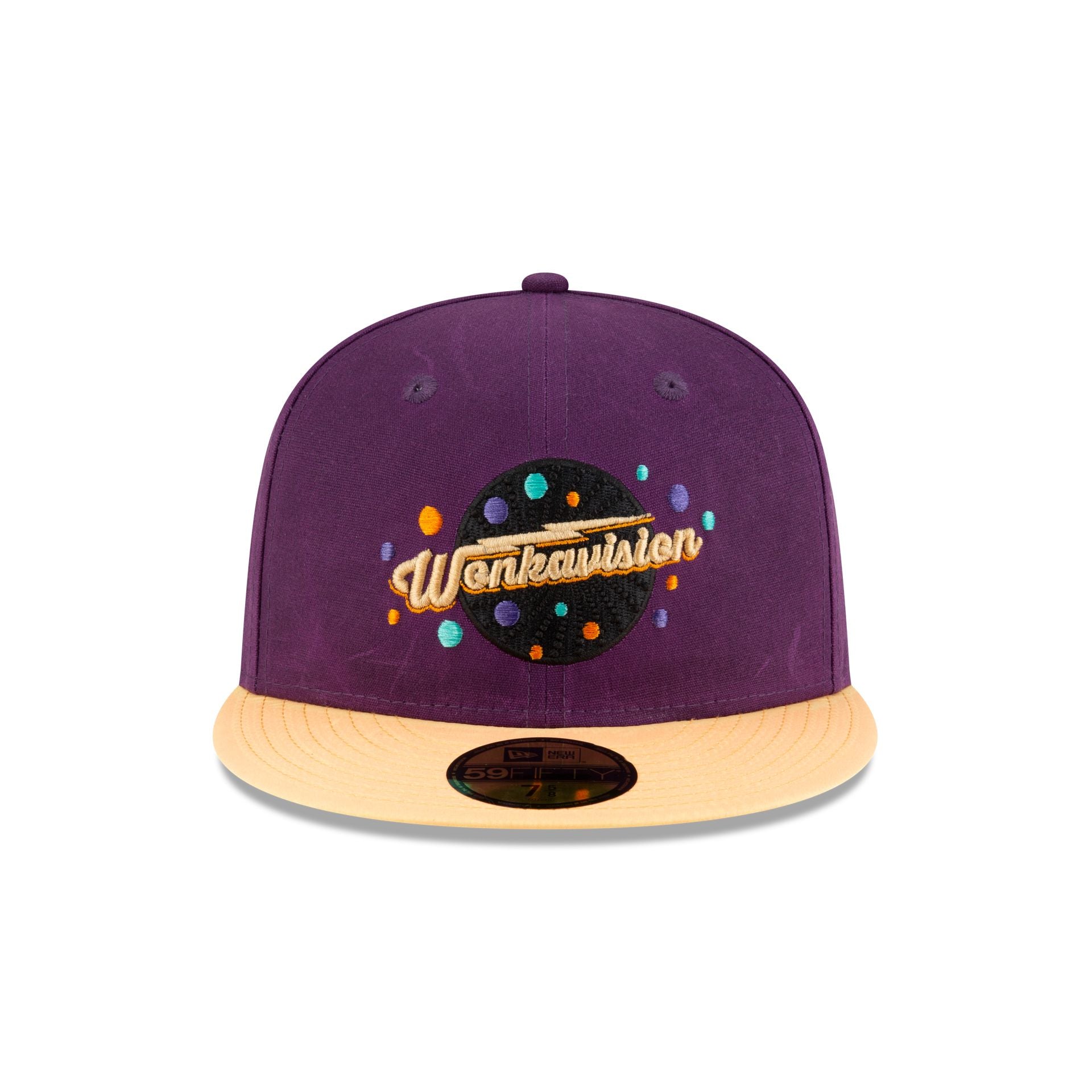 The Willy Wonka Wonkavision 59FIFTY Fitted Cap features an embroidered Wonka Wonkavision logo at the front panels and a Willy Wonka patch at the right-wear side. Additional details include a Wonka logo at the rear and a Wonkavision undervisor.