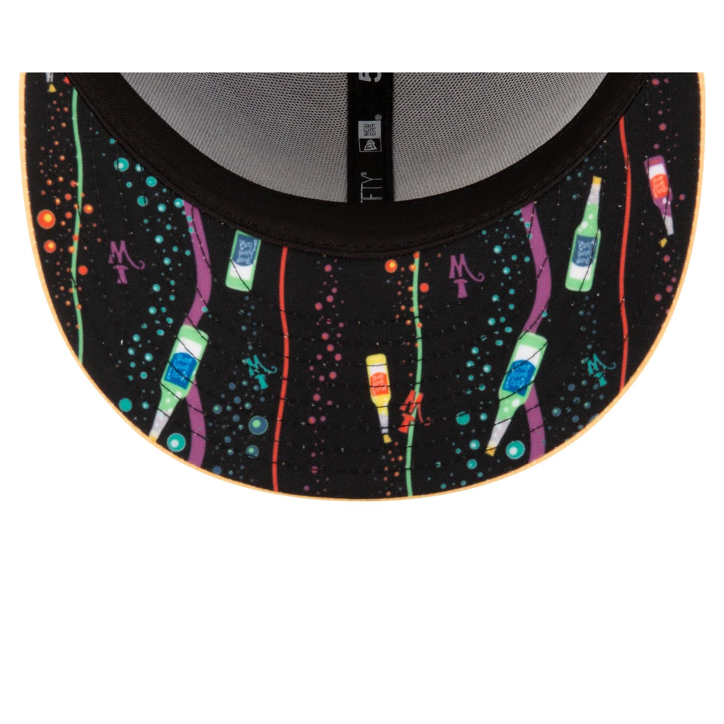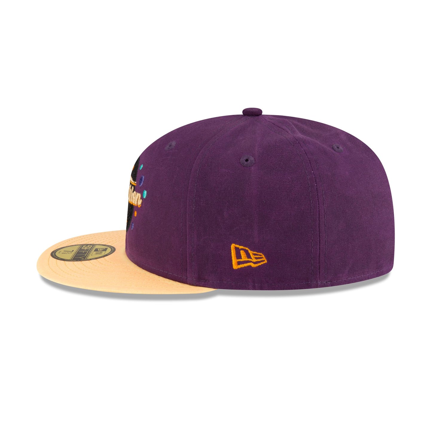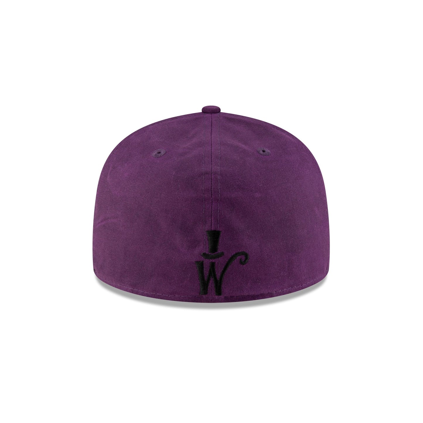 The Willy Wonka Wonkavision 59FIFTY Fitted Cap features an embroidered Wonka Wonkavision logo at the front panels and a Willy Wonka patch at the right-wear side. Additional details include a Wonka logo at the rear and a Wonkavision undervisor.