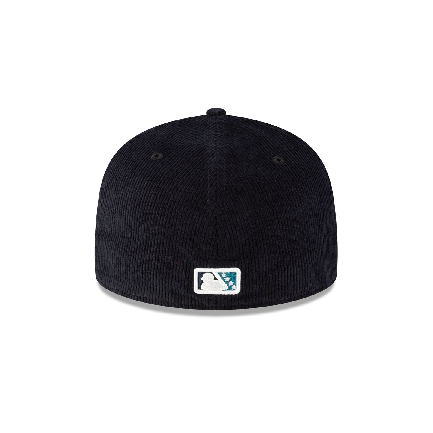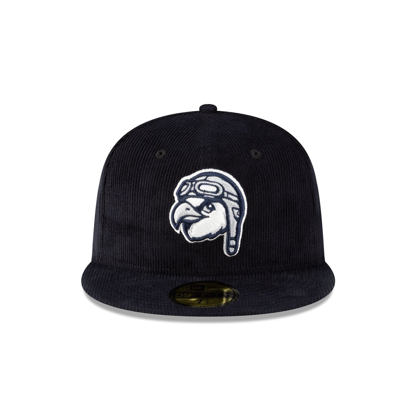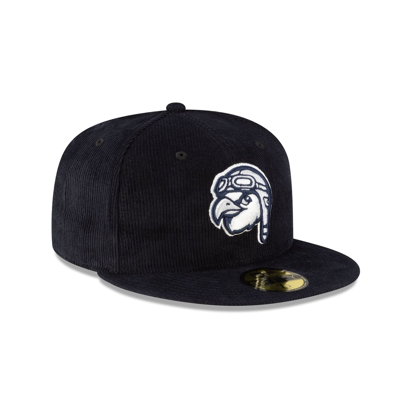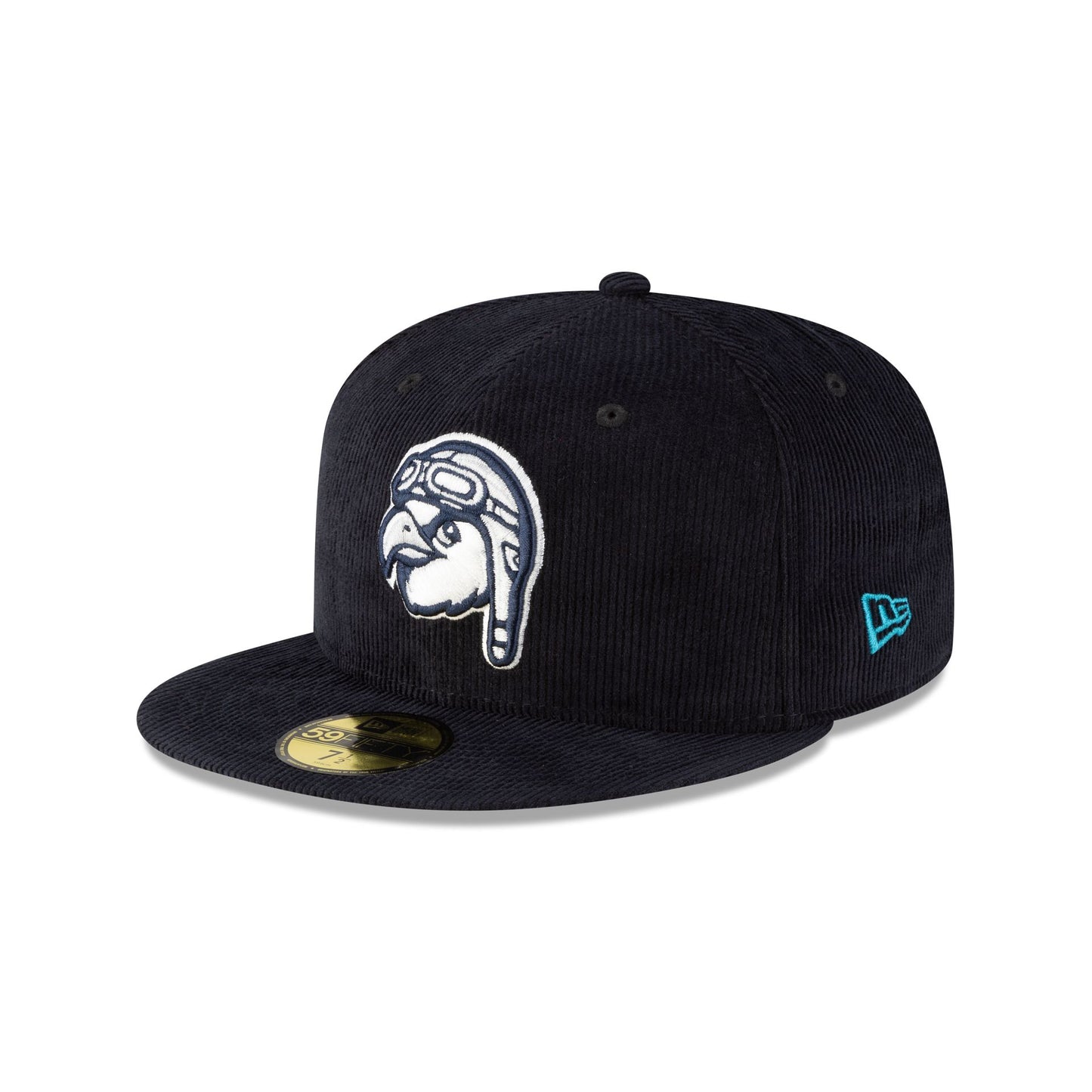 The Wilson Warbirds Corduroy 59FIFTY Fitted features an embroidered Warbirds mascot at the front panels with a matching MiLB Batterman logo at the rear and a green undervisor.