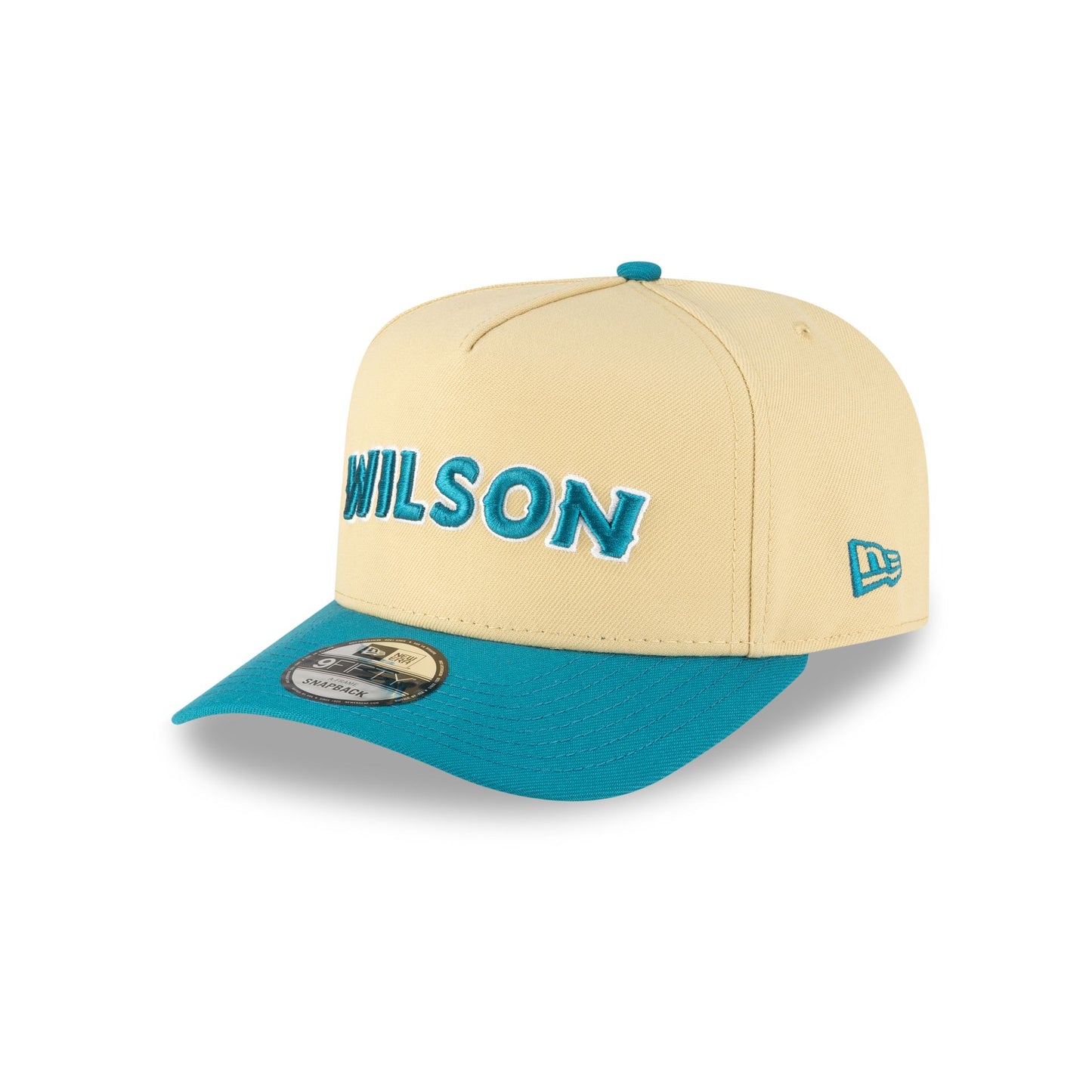 The Wilson Warbirds Vegas Gold Pre-Curved 9FIFTY A-Frame Snapback features an embroidered Warbirds wordmark at the front panel with an adjustable snapback closure at the rear. Additional details include a 2026 Inaugural Season team patch at the right-wear side with a teal pre-curved visor and a gray undervisor.