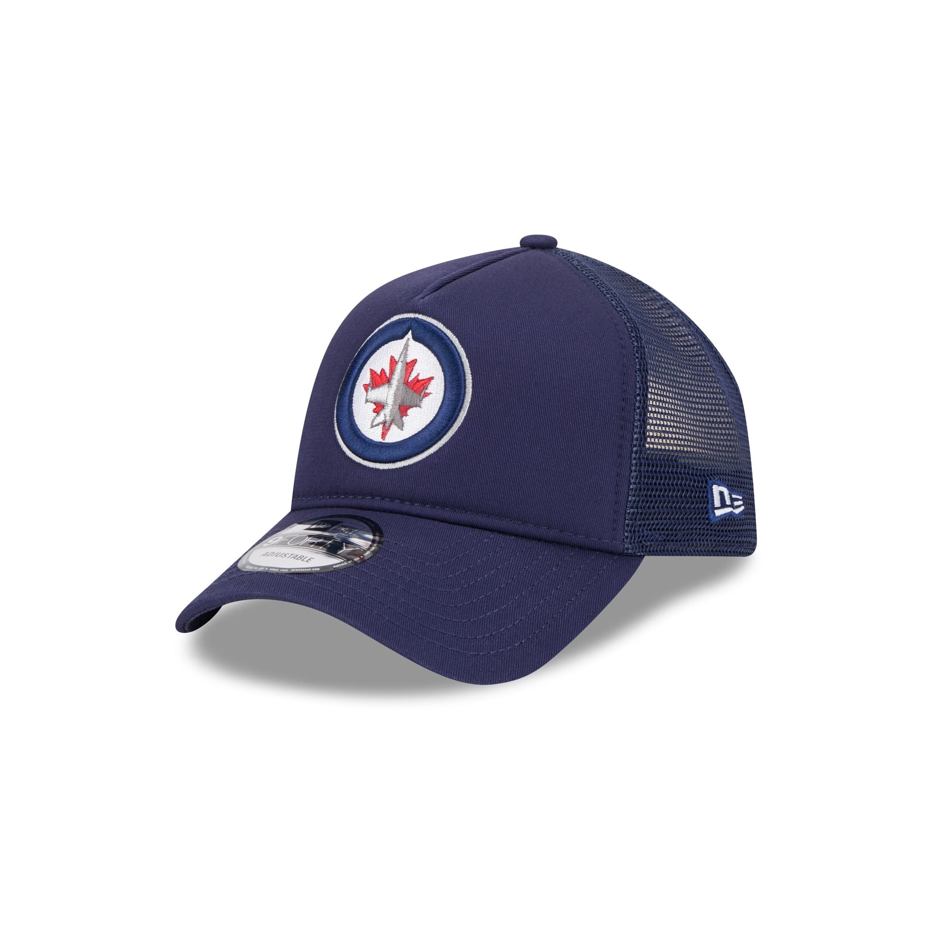 The Winnipeg Jets 9FORTY A-Frame Trucker features an embroidered Jets logo at the front panels with a mesh back and snapback closure at the rear.