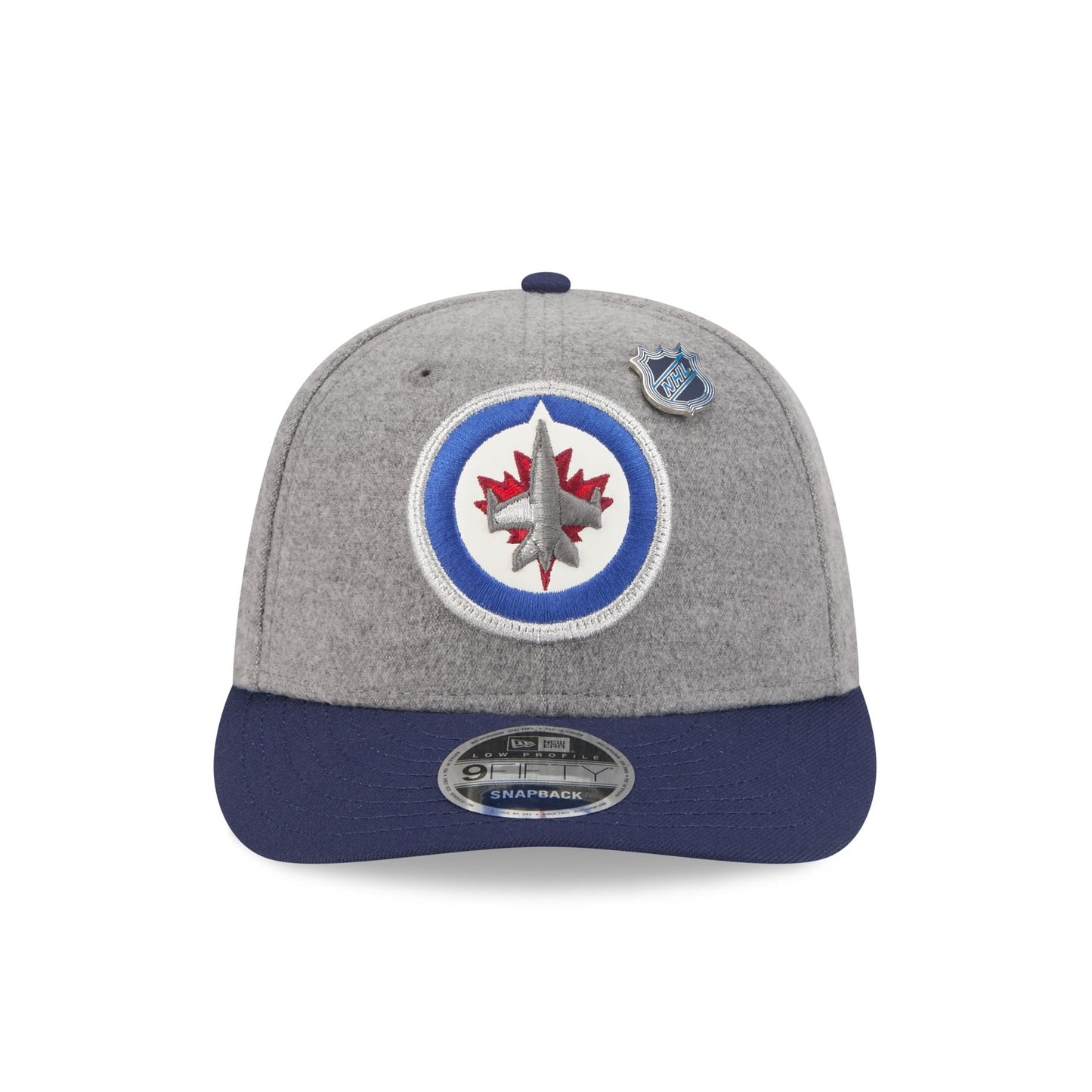 The Winnipeg Jets Heather Gray Wool Low Profile 9FIFTY snapback features a faux leather applique Jets logo at the front panels against a wool fabrication throughout the cap. Additional details include a conference patch at the right-wear side, an NHL pin at the front, and a script wordmark above an adjustable snapback closure at the rear.