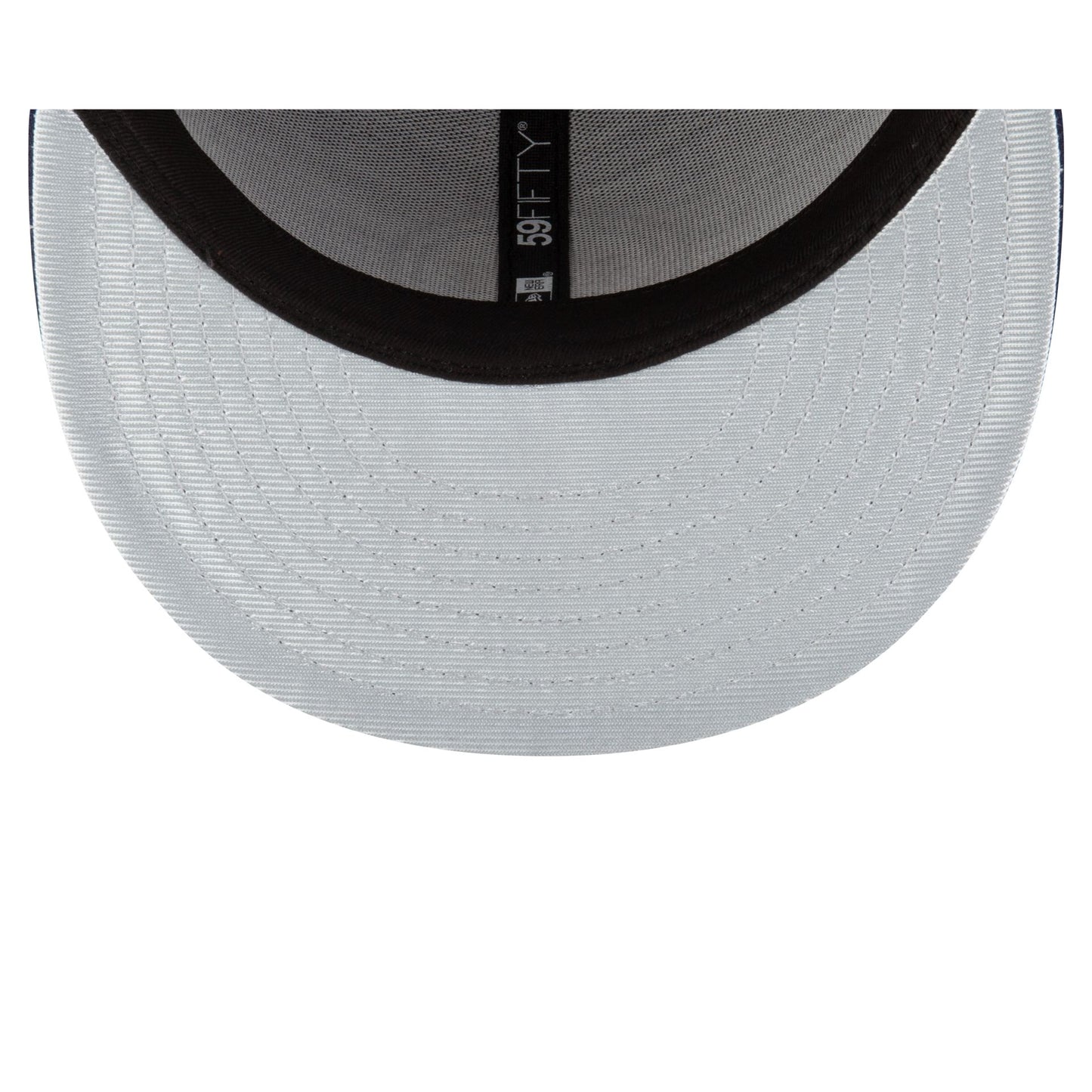 The Winnipeg Jets Navy 59FIFTY Fitted Cap features an embroidered Jets logo at the front panels with a matching NHL Shield at the rear and a gray undervisor.